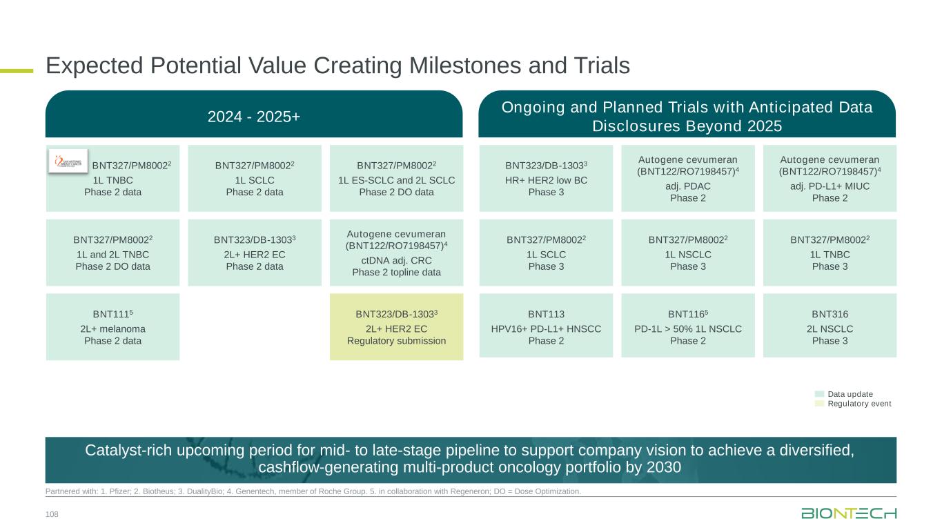 2H 2024 2025+ BNT327/PM80022 1L TNBC Phase 2 data BNT327/PM80022 1L SCLC Phase 2 data BNT327/PM80022 1L ES-SCLC and 2L SCLC Phase 2 DO data BNT323/DB-13033 HR+ HER2 low BC Phase 3 Autogene cevumeran (BNT122/RO7198457)4 adj. PDAC Phase 2 Autogene cevumeran (BNT122/RO7198457)4 adj. PD-L1+ MIUC Phase 2 BNT327/PM80022 1L and 2L TNBC Phase 2 DO data BNT323/DB-13033 2L+ HER2 EC Phase 2 data Autogene cevumeran (BNT122/RO7198457)4 ctDNA adj. CRC Phase 2 topline data BNT327/PM80022 1L SCLC Phase 3 BNT327/PM80022 1L NSCLC Phase 3 BNT327/PM80022 1L TNBC Phase 3 BNT1115 2L+ melanoma Phase 2 data BNT323/DB-13033 2L+ HER2 EC Regulatory submission BNT113 HPV16+ PD-L1+ HNSCC Phase 2 BNT1165 PD-1L > 50% 1L NSCLC Phase 2 BNT316 2L NSCLC Phase 3 Expected Potential Value Creating Milestones and Trials Partnered with: 1. Pfizer; 2. Biotheus; 3. DualityBio; 4. Genentech, member of Roche Group. 5. in collaboration with Regeneron; DO = Dose Optimization. Catalyst-rich upcoming period for mid- to late-stage pipeline to support company vision to achieve a diversified, cashflow-generating multi-product oncology portfolio by 2030 2024 - 2025+ Ongoing and Planned Trials with Anticipated Data Disclosures Beyond 2025 Data update Regulatory event 108