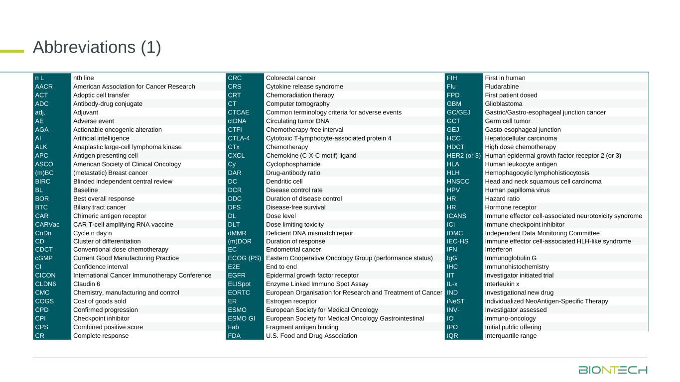 Abbreviations (1) n L nth line CRC Colorectal cancer FIH First in human AACR American Association for Cancer Research CRS Cytokine release syndrome Flu Fludarabine ACT Adoptic cell transfer CRT Chemoradiation therapy FPD First patient dosed ADC Antibody-drug conjugate CT Computer tomography GBM Glioblastoma adj. Adjuvant CTCAE Common terminology criteria for adverse events GC/GEJ Gastric/Gastro-esophageal junction cancer AE Adverse event ctDNA Circulating tumor DNA GCT Germ cell tumor AGA Actionable oncogenic alteration CTFI Chemotherapy-free interval GEJ Gasto-esophageal junction AI Artificial intelligence CTLA-4 Cytotoxic T-lymphocyte-associated protein 4 HCC Hepatocellular carcinoma ALK Anaplastic large-cell lymphoma kinase CTx Chemotherapy HDCT High dose chemotherapy APC Antigen presenting cell CXCL Chemokine (C-X-C motif) ligand HER2 (or 3) Human epidermal growth factor receptor 2 (or 3) ASCO American Society of Clinical Oncology Cy Cyclophosphamide HLA Human leukocyte antigen (m)BC (metastatic) Breast cancer DAR Drug-antibody ratio HLH Hemophagocytic lymphohistiocytosis BIRC Blinded independent central review DC Dendritic cell HNSCC Head and neck squamous cell carcinoma BL Baseline DCR Disease control rate HPV Human papilloma virus BOR Best overall response DDC Duration of disease control HR Hazard ratio BTC Biliary tract cancer DFS Disease-free survival HR Hormone receptor CAR Chimeric antigen receptor DL Dose level ICANS Immune effector cell-associated neurotoxicity syndrome CARVac CAR T-cell amplifying RNA vaccine DLT Dose limiting toxicity ICI Immune checkpoint inhibitor CnDn Cycle n day n dMMR Deficient DNA mismatch repair IDMC Independent Data Monitoring Committee CD Cluster of differentiation (m)DOR Duration of response IEC-HS Immune effector cell-associated HLH-like syndrome CDCT Conventional dose chemotherapy EC Endometrial cancer IFN Interferon cGMP Current Good Manufacturing Practice ECOG (PS) Eastern Cooperative Oncology Group (performance status) IgG Immunoglobulin G CI Confidence interval E2E End to end IHC Immunohistochemistry CICON International Cancer Immunotherapy Conference EGFR Epidermal growth factor receptor IIT Investigator initiated trial CLDN6 Claudin 6 ELISpot Enzyme Linked Immuno Spot Assay IL-x Interleukin x CMC Chemistry, manufacturing and control EORTC European Organisation for Research and Treatment of Cancer IND Investigational new drug COGS Cost of goods sold ER Estrogen receptor iNeST Individualized NeoAntigen-Specific Therapy CPD Confirmed progression ESMO European Society for Medical Oncology INV- Investigator assessed CPI Checkpoint inhibitor ESMO GI European Society for Medical Oncology Gastrointestinal IO Immuno-oncology CPS Combined positive score Fab Fragment antigen binding IPO Initial public offering CR Complete response FDA U.S. Food and Drug Association IQR Interquartile range