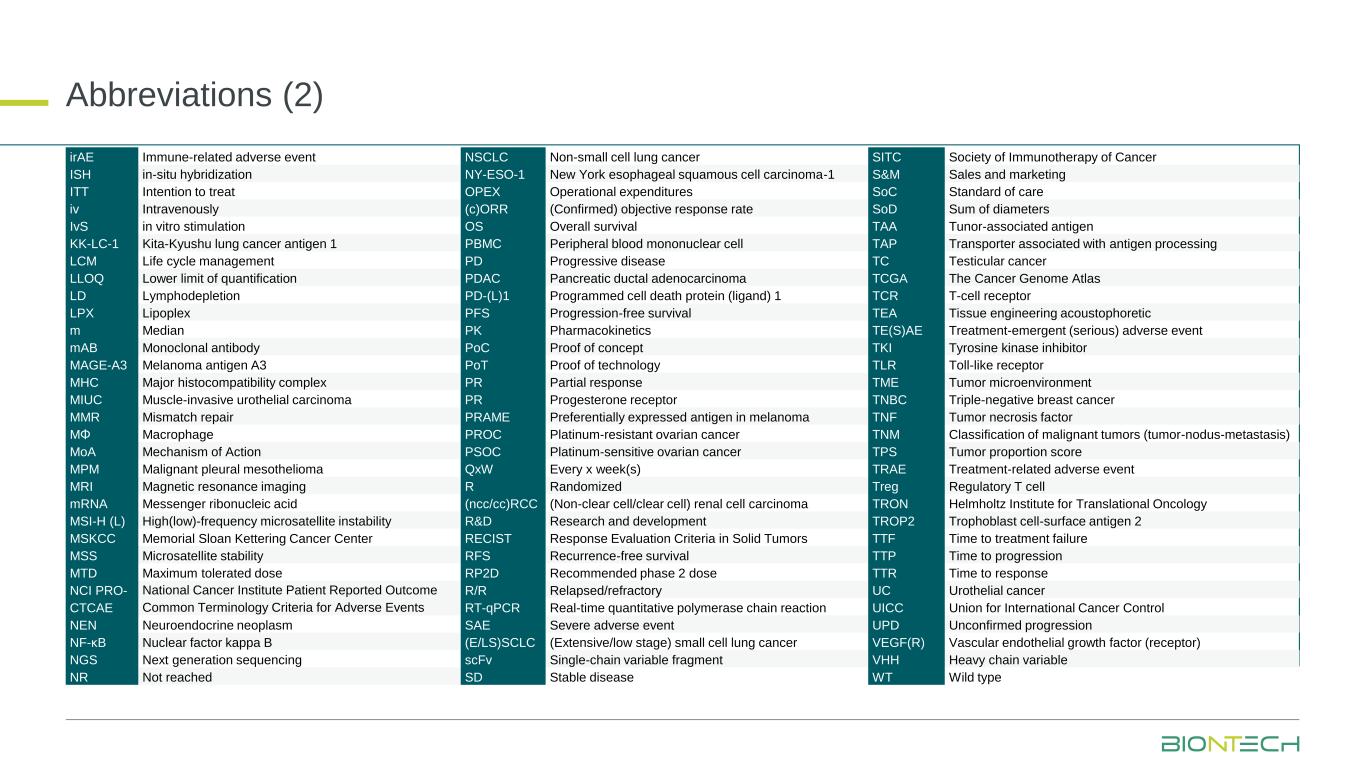 Abbreviations (2) irAE Immune-related adverse event NSCLC Non-small cell lung cancer SITC Society of Immunotherapy of Cancer ISH in-situ hybridization NY-ESO-1 New York esophageal squamous cell carcinoma-1 S&M Sales and marketing ITT Intention to treat OPEX Operational expenditures SoC Standard of care iv Intravenously (c)ORR (Confirmed) objective response rate SoD Sum of diameters IvS in vitro stimulation OS Overall survival TAA Tunor-associated antigen KK-LC-1 Kita-Kyushu lung cancer antigen 1 PBMC Peripheral blood mononuclear cell TAP Transporter associated with antigen processing LCM Life cycle management PD Progressive disease TC Testicular cancer LLOQ Lower limit of quantification PDAC Pancreatic ductal adenocarcinoma TCGA The Cancer Genome Atlas LD Lymphodepletion PD-(L)1 Programmed cell death protein (ligand) 1 TCR T-cell receptor LPX Lipoplex PFS Progression-free survival TEA Tissue engineering acoustophoretic m Median PK Pharmacokinetics TE(S)AE Treatment-emergent (serious) adverse event mAB Monoclonal antibody PoC Proof of concept TKI Tyrosine kinase inhibitor MAGE-A3 Melanoma antigen A3 PoT Proof of technology TLR Toll-like receptor MHC Major histocompatibility complex PR Partial response TME Tumor microenvironment MIUC Muscle-invasive urothelial carcinoma PR Progesterone receptor TNBC Triple-negative breast cancer MMR Mismatch repair PRAME Preferentially expressed antigen in melanoma TNF Tumor necrosis factor MΦ Macrophage PROC Platinum-resistant ovarian cancer TNM Classification of malignant tumors (tumor-nodus-metastasis) MoA Mechanism of Action PSOC Platinum-sensitive ovarian cancer TPS Tumor proportion score MPM Malignant pleural mesothelioma QxW Every x week(s) TRAE Treatment-related adverse event MRI Magnetic resonance imaging R Randomized Treg Regulatory T cell mRNA Messenger ribonucleic acid (ncc/cc)RCC (Non-clear cell/clear cell) renal cell carcinoma TRON Helmholtz Institute for Translational Oncology MSI-H (L) High(low)-frequency microsatellite instability R&D Research and development TROP2 Trophoblast cell-surface antigen 2 MSKCC Memorial Sloan Kettering Cancer Center RECIST Response Evaluation Criteria in Solid Tumors TTF Time to treatment failure MSS Microsatellite stability RFS Recurrence-free survival TTP Time to progression MTD Maximum tolerated dose RP2D Recommended phase 2 dose TTR Time to response NCI PRO- National Cancer Institute Patient Reported Outcome R/R Relapsed/refractory UC Urothelial cancer CTCAE Common Terminology Criteria for Adverse Events RT-qPCR Real-time quantitative polymerase chain reaction UICC Union for International Cancer Control NEN Neuroendocrine neoplasm SAE Severe adverse event UPD Unconfirmed progression NF-κB Nuclear factor kappa B (E/LS)SCLC (Extensive/low stage) small cell lung cancer VEGF(R) Vascular endothelial growth factor (receptor) NGS Next generation sequencing scFv Single-chain variable fragment VHH Heavy chain variable NR Not reached SD Stable disease WT Wild type