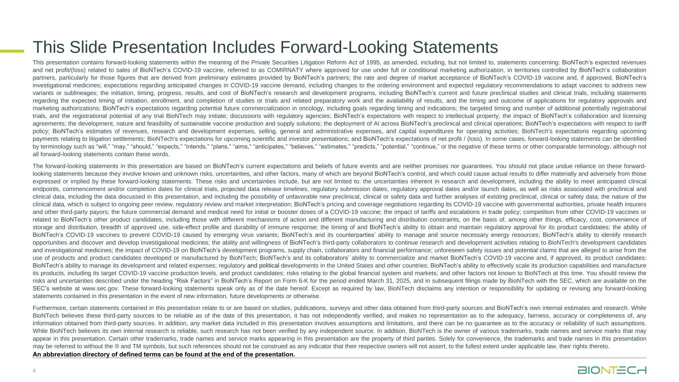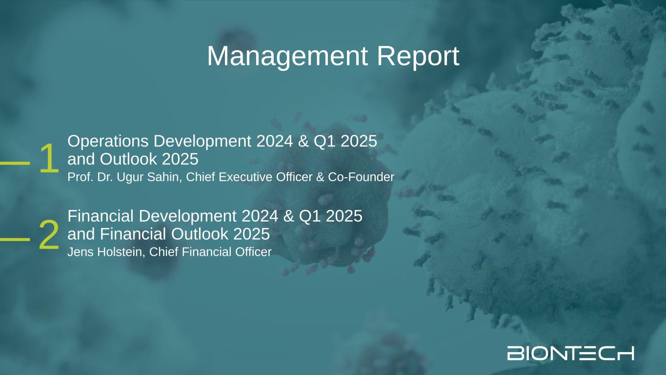 Management Report 2 1 Operations Development 2024 & Q1 2025 and Outlook 2025 Prof. Dr. Ugur Sahin, Chief Executive Officer & Co-Founder Financial Development 2024 & Q1 2025 and Financial Outlook 2025 Jens Holstein, Chief Financial Officer