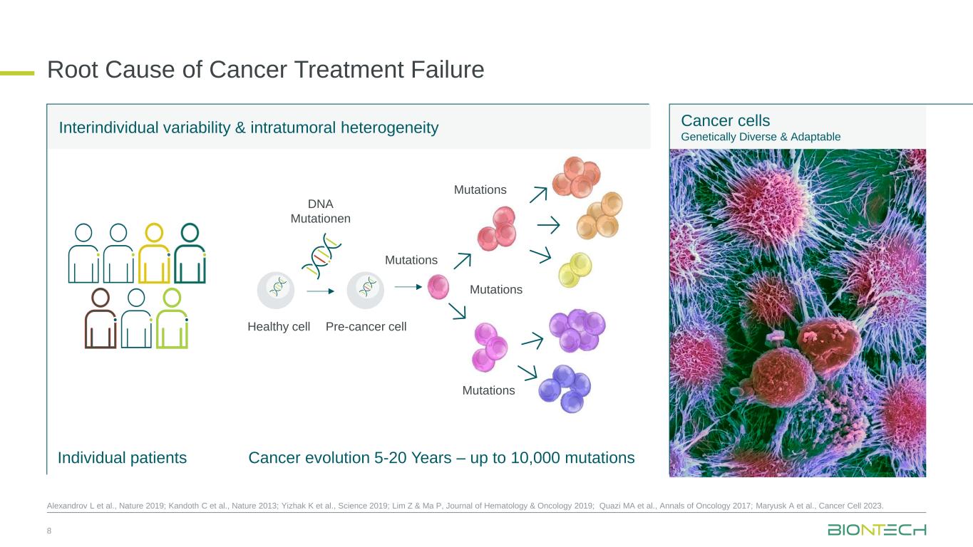 Interindividual variability & intratumoral heterogeneity Root Cause of Cancer Treatment Failure Cancer cells Genetically Diverse & Adaptable Cancer evolution 5-20 Years – up to 10,000 mutationsIndividual patients 8 Alexandrov L et al., Nature 2019; Kandoth C et al., Nature 2013; Yizhak K et al., Science 2019; Lim Z & Ma P, Journal of Hematology & Oncology 2019; Quazi MA et al., Annals of Oncology 2017; Maryusk A et al., Cancer Cell 2023. DNA Mutationen Healthy cell Mutations Pre-cancer cell Mutations Mutations Mutations