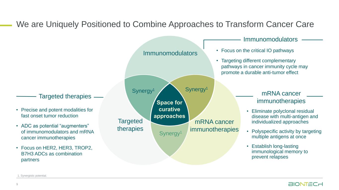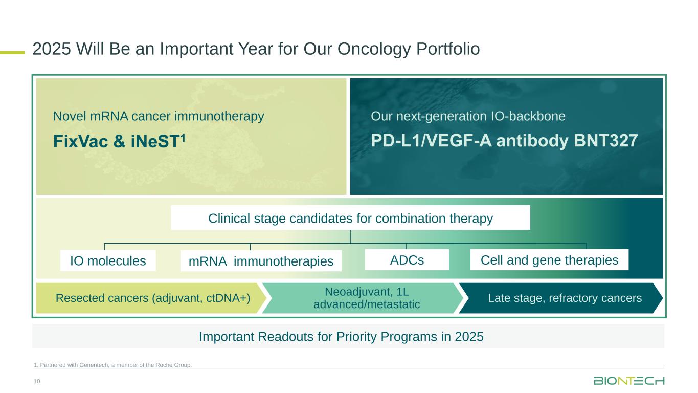 Space for curative approaches Immunomodulators mRNA cancer immunotherapies Targeted therapies Synergy1 Synergy1 Synergy1 • Focus on the critical IO pathways • Targeting different complementary pathways in cancer immunity cycle may promote a durable anti-tumor effect • Eliminate polyclonal residual disease with multi-antigen and individualized approaches • Polyspecific activity by targeting multiple antigens at once • Establish long-lasting immunological memory to prevent relapses • Precise and potent modalities for fast onset tumor reduction • ADC as potential “augmenters” of immunomodulators and mRNA cancer immunotherapies • Focus on HER2, HER3, TROP2, B7H3 ADCs as combination partners 9 Immunomodulators Targeted therapies mRNA cancer immunotherapies We are Uniquely Positioned to Combine Approaches to Transform Cancer Care 1. Synergistic potential.