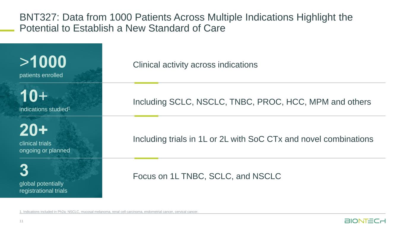 10 1. Partnered with Genentech, a member of the Roche Group. 2025 Will Be an Important Year for Our Oncology Portfolio PD-L1/VEGF-A antibody BNT327 Novel mRNA cancer immunotherapy FixVac & iNeST1 Our next-generation IO-backbone Resected cancers (adjuvant, ctDNA+) Neoadjuvant, 1L advanced/metastatic Late stage, refractory cancers Clinical stage candidates for combination therapy ADCs Cell and gene therapiesIO molecules mRNA immunotherapies Important Readouts for Priority Programs in 2025