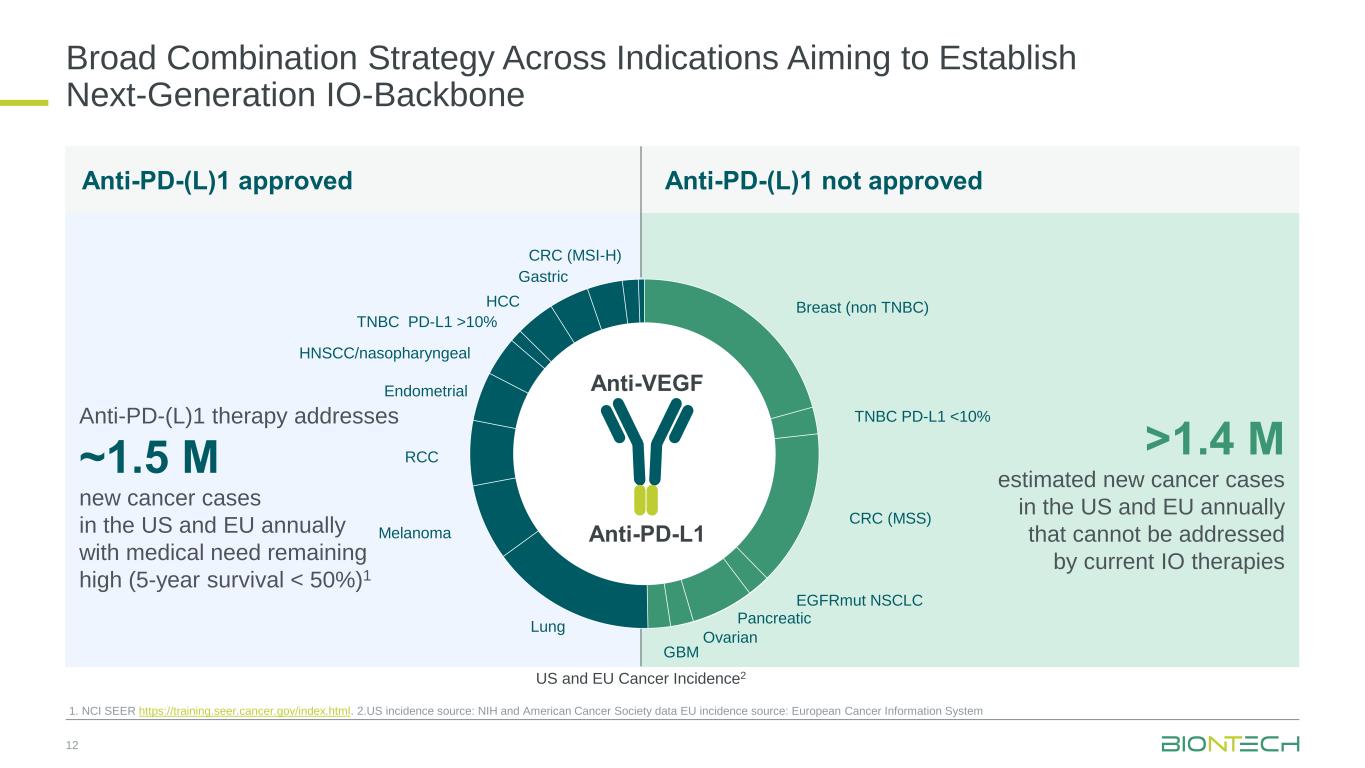 Broad Combination Strategy Across Indications Aiming to Establish Next-Generation IO-Backbone 12 1. NCI SEER https://training.seer.cancer.gov/index.html. 2.US incidence source: NIH and American Cancer Society data EU incidence source: European Cancer Information System Anti-PD-L1 Anti-VEGF Anti-PD-(L)1 therapy addresses ~1.5 M new cancer cases in the US and EU annually with medical need remaining high (5-year survival < 50%)1 >1.4 M estimated new cancer cases in the US and EU annually that cannot be addressed by current IO therapies Anti-PD-(L)1 approved Anti-PD-(L)1 not approved US and EU Cancer Incidence2 Breast (non TNBC) TNBC PD-L1 <10% CRC (MSS) EGFRmut NSCLC Pancreatic Ovarian GBM Lung Melanoma RCC Endometrial HNSCC/nasopharyngeal TNBC PD-L1 >10% HCC Gastric CRC (MSI-H)