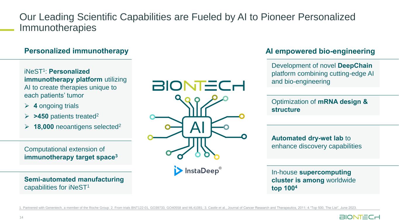 Our Leading Scientific Capabilities are Fueled by AI to Pioneer Personalized Immunotherapies 14 1. Partnered with Genentech, a member of the Roche Group. 2. From trials BNT122-01, GO39733, GO40558 and ML41081; 3. Castle et al., Journal of Cancer Research and Therapeutics, 2011; 4.“Top 500, The List”, June 2023. Semi-automated manufacturing capabilities for iNeST1 iNeST1: Personalized immunotherapy platform utilizing AI to create therapies unique to each patients’ tumor ➢ 4 ongoing trials ➢ >450 patients treated2 ➢ 18,000 neoantigens selected2 Development of novel DeepChain platform combining cutting-edge AI and bio-engineering Automated dry-wet lab to enhance discovery capabilities In-house supercomputing cluster is among worldwide top 1004 AI empowered bio-engineeringPersonalized immunotherapy Optimization of mRNA design & structure Computational extension of immunotherapy target space3 AI