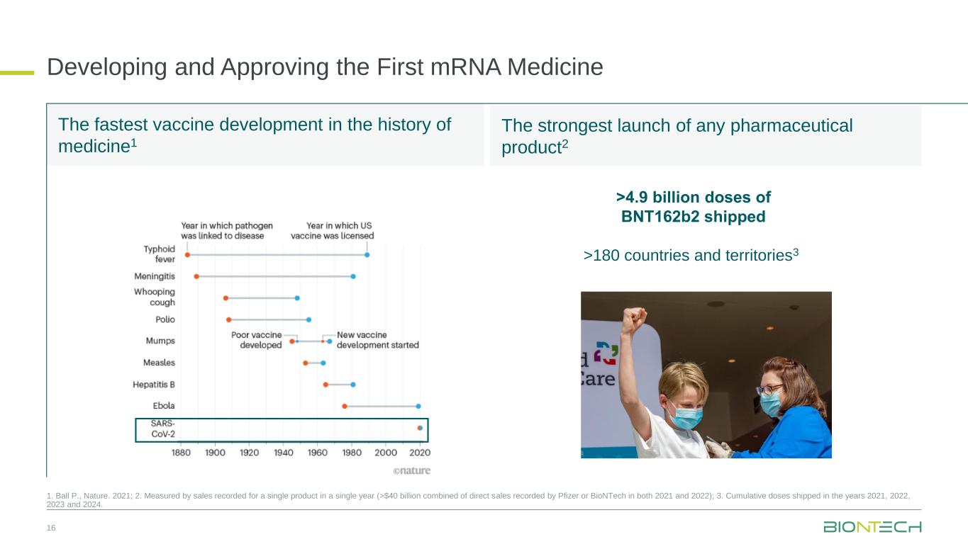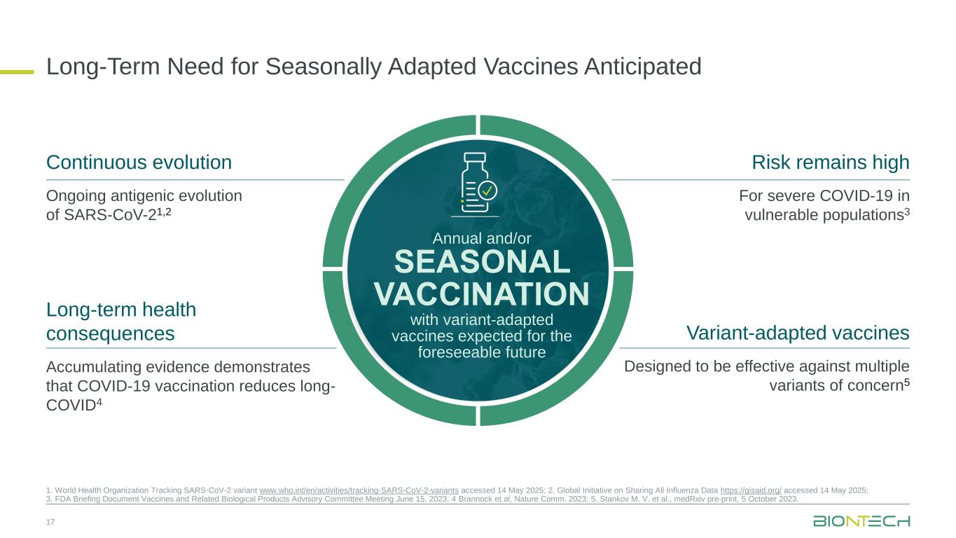 16 >4.9 billion doses of BNT162b2 shipped >180 countries and territories3 The fastest vaccine development in the history of medicine1 The strongest launch of any pharmaceutical product2 Developing and Approving the First mRNA Medicine 1. Ball P., Nature. 2021; 2. Measured by sales recorded for a single product in a single year (>$40 billion combined of direct sales recorded by Pfizer or BioNTech in both 2021 and 2022); 3. Cumulative doses shipped in the years 2021, 2022, 2023 and 2024.