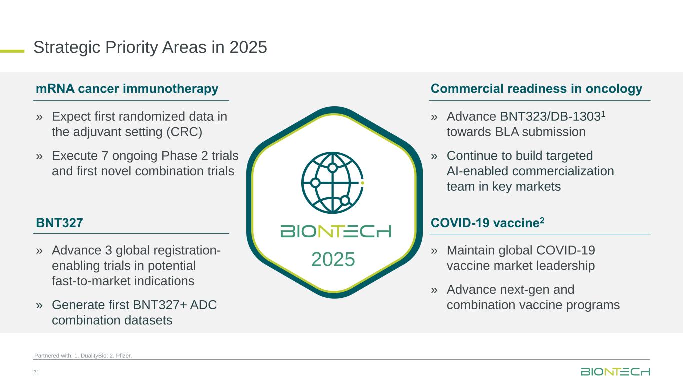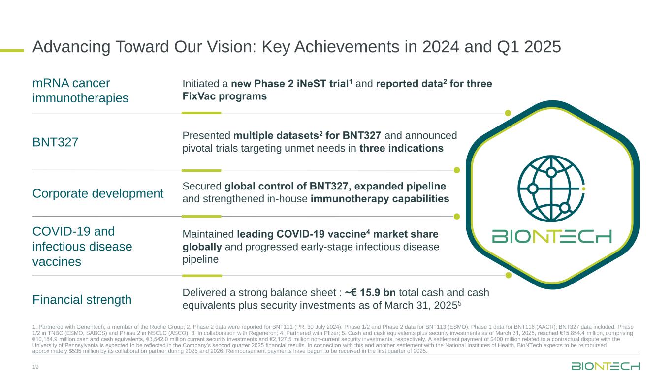 4 This Slide Presentation Includes Forward-Looking Statements This presentation contains forward-looking statements within the meaning of the Private Securities Litigation Reform Act of 1995, as amended, including, but not limited to, statements concerning: BioNTech’s expected revenues and net profit/(loss) related to sales of BioNTech’s COVID-19 vaccine, referred to as COMIRNATY where approved for use under full or conditional marketing authorization, in territories controlled by BioNTech’s collaboration partners, particularly for those figures that are derived from preliminary estimates provided by BioNTech’s partners; the rate and degree of market acceptance of BioNTech’s COVID-19 vaccine and, if approved, BioNTech’s investigational medicines; expectations regarding anticipated changes in COVID-19 vaccine demand, including changes to the ordering environment and expected regulatory recommendations to adapt vaccines to address new variants or sublineages; the initiation, timing, progress, results, and cost of BioNTech’s research and development programs, including BioNTech’s current and future preclinical studies and clinical trials, including statements regarding the expected timing of initiation, enrollment, and completion of studies or trials and related preparatory work and the availability of results, and the timing and outcome of applications for regulatory approvals and marketing authorizations; BioNTech’s expectations regarding potential future commercialization in oncology, including goals regarding timing and indications; the targeted timing and number of additional potentially registrational trials, and the registrational potential of any trial BioNTech may initiate; discussions with regulatory agencies; BioNTech’s expectations with respect to intellectual property; the impact of BioNTech’s collaboration and licensing agreements; the development, nature and feasibility of sustainable vaccine production and supply solutions; the deployment of AI across BioNTech’s preclinical and clinical operations; BioNTech’s expectations with respect to tariff policy; BioNTech’s estimates of revenues, research and development expenses, selling, general and administrative expenses, and capital expenditures for operating activities; BioNTech's expectations regarding upcoming payments relating to litigation settlements; BioNTech's expectations for upcoming scientific and investor presentations; and BioNTech’s expectations of net profit / (loss). In some cases, forward-looking statements can be identified by terminology such as “will,” “may,” “should,” “expects,” “intends,” “plans,” “aims,” “anticipates,” “believes,” “estimates,” “predicts,” “potential,” “continue,” or the negative of these terms or other comparable terminology, although not all forward-looking statements contain these words. The forward-looking statements in this presentation are based on BioNTech’s current expectations and beliefs of future events and are neither promises nor guarantees. You should not place undue reliance on these forward- looking statements because they involve known and unknown risks, uncertainties, and other factors, many of which are beyond BioNTech’s control, and which could cause actual results to differ materially and adversely from those expressed or implied by these forward-looking statements. These risks and uncertainties include, but are not limited to: the uncertainties inherent in research and development, including the ability to meet anticipated clinical endpoints, commencement and/or completion dates for clinical trials, projected data release timelines, regulatory submission dates, regulatory approval dates and/or launch dates, as well as risks associated with preclinical and clinical data, including the data discussed in this presentation, and including the possibility of unfavorable new preclinical, clinical or safety data and further analyses of existing preclinical, clinical or safety data; the nature of the clinical data, which is subject to ongoing peer review, regulatory review and market interpretation; BioNTech’s pricing and coverage negotiations regarding its COVID-19 vaccine with governmental authorities, private health insurers and other third-party payors; the future commercial demand and medical need for initial or booster doses of a COVID-19 vaccine; the impact of tariffs and escalations in trade policy; competition from other COVID-19 vaccines or related to BioNTech’s other product candidates, including those with different mechanisms of action and different manufacturing and distribution constraints, on the basis of, among other things, efficacy, cost, convenience of storage and distribution, breadth of approved use, side-effect profile and durability of immune response; the timing of and BioNTech’s ability to obtain and maintain regulatory approval for its product candidates; the ability of BioNTech’s COVID-19 vaccines to prevent COVID-19 caused by emerging virus variants; BioNTech’s and its counterparties’ ability to manage and source necessary energy resources; BioNTech’s ability to identify research opportunities and discover and develop investigational medicines; the ability and willingness of BioNTech’s third-party collaborators to continue research and development activities relating to BioNTech's development candidates and investigational medicines; the impact of COVID-19 on BioNTech’s development programs, supply chain, collaborators and financial performance; unforeseen safety issues and potential claims that are alleged to arise from the use of products and product candidates developed or manufactured by BioNTech; BioNTech’s and its collaborators’ ability to commercialize and market BioNTech’s COVID-19 vaccine and, if approved, its product candidates; BioNTech’s ability to manage its development and related expenses; regulatory and political developments