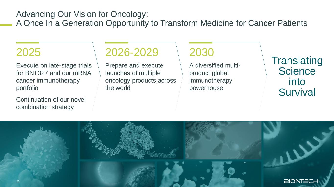 21 Partnered with: 1. DualityBio; 2. Pfizer. Strategic Priority Areas in 2025 mRNA cancer immunotherapy BNT327 Commercial readiness in oncology COVID-19 vaccine2 » Expect first randomized data in the adjuvant setting (CRC) » Execute 7 ongoing Phase 2 trials and first novel combination trials » Advance 3 global registration- enabling trials in potential fast-to-market indications » Generate first BNT327+ ADC combination datasets » Advance BNT323/DB-13031 towards BLA submission » Continue to build targeted AI-enabled commercialization team in key markets » Maintain global COVID-19 vaccine market leadership » Advance next-gen and combination vaccine programs 2025