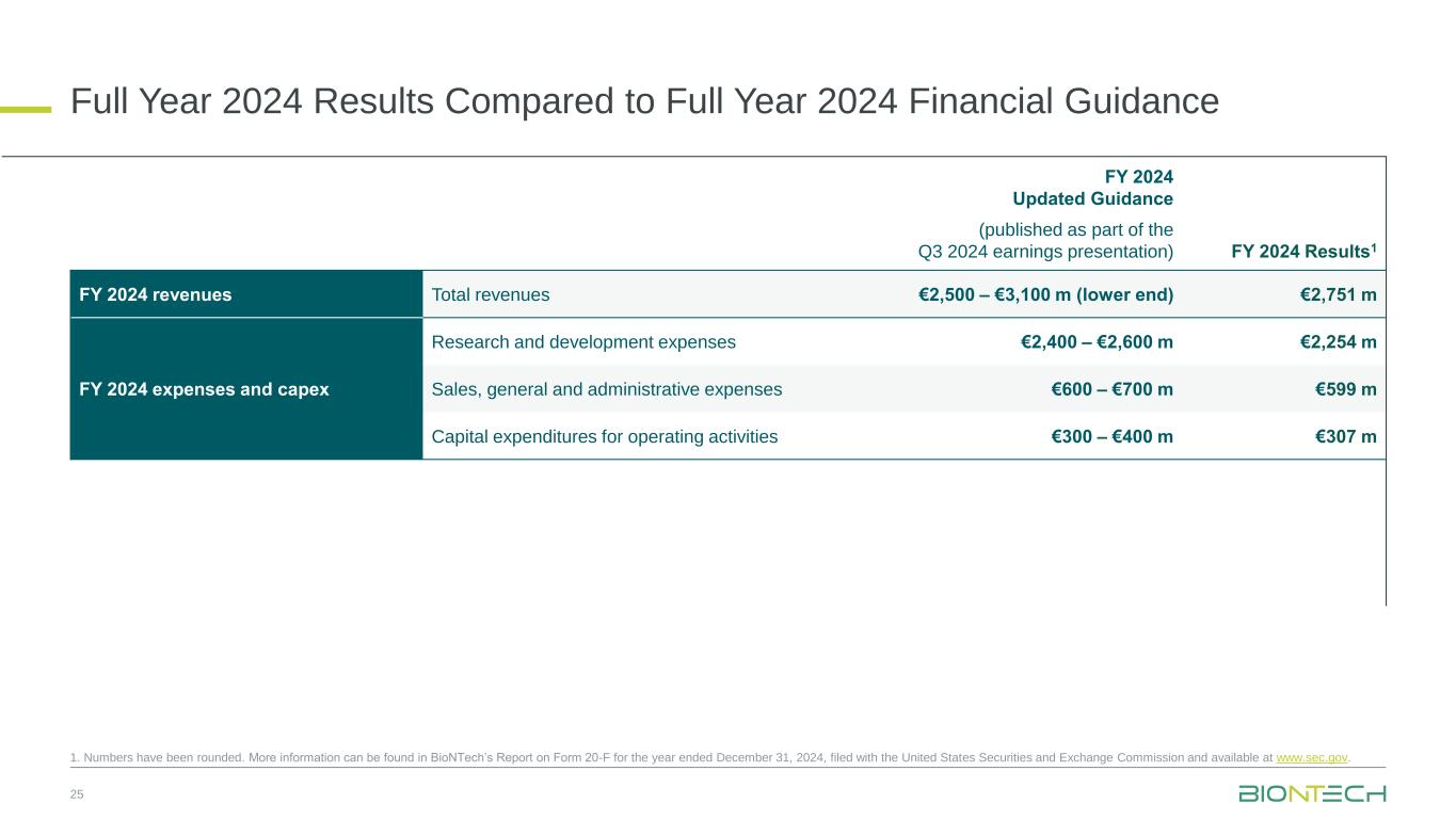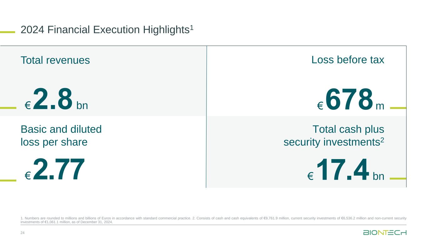 2024 Financial Execution Highlights1 24 Loss before tax € 2.77 € 678 m € 2.8 bn € 17.4 bn Total revenues Basic and diluted loss per share Total cash plus security investments2 1. Numbers are rounded to millions and billions of Euros in accordance with standard commercial practice. 2. Consists of cash and cash equivalents of €9,761.9 million, current security investments of €6,536.2 million and non-current security investments of €1,061.1 million, as of December 31, 2024.