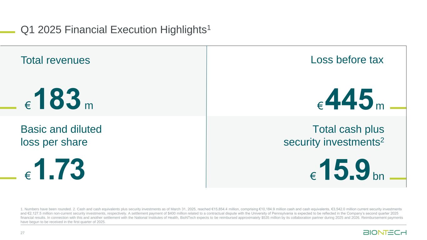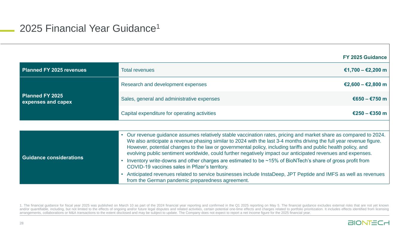 Q1 2025 Financial Execution Highlights1 27 Loss before tax € 1.73 € 445 m € 183 m € 15.9 bn Total revenues Basic and diluted loss per share Total cash plus security investments2 1. Numbers have been rounded. 2. Cash and cash equivalents plus security investments as of March 31, 2025, reached €15,854.4 million, comprising €10,184.9 million cash and cash equivalents, €3,542.0 million current security investments and €2,127.5 million non-current security investments, respectively. A settlement payment of $400 million related to a contractual dispute with the University of Pennsylvania is expected to be reflected in the Company’s second quarter 2025 financial results. In connection with this and another settlement with the National Institutes of Health, BioNTech expects to be reimbursed approximately $535 million by its collaboration partner during 2025 and 2026. Reimbursement payments have begun to be received in the first quarter of 2025.