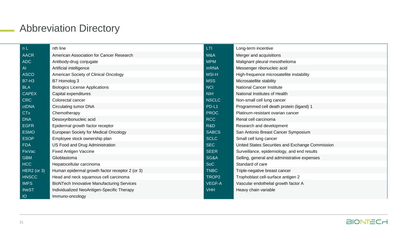 Abbreviation Directory n L nth line LTI Long-term incentive AACR American Association for Cancer Research M&A Merger and acquisitions ADC Antibody-drug conjugate MPM Malignant pleural mesothelioma AI Artificial intelligence mRNA Messenger ribonucleic acid ASCO American Society of Clinical Oncology MSI-H High-frequence microsatellite instability B7-H3 B7 Homolog 3 MSS Microsatellite stability BLA Biologics License Applications NCI National Cancer Institute CAPEX Capital expenditures NIH National Institutes of Health CRC Colorectal cancer NSCLC Non-small cell lung cancer ctDNA Circulating tumor DNA PD-L1 Programmed cell death protein (ligand) 1 CTx Chemotherapy PROC Platinum-resistant ovarian cancer DNA Desoxyribonucleic acid RCC Renal cell carcinoma EGFR Epidermal growth factor receptor R&D Research and development ESMO European Society for Medical Oncology SABCS San Antonio Breast Cancer Symposium ESOP Employee stock ownership plan SCLC Small cell lung cancer FDA US Food and Drug Administration SEC United States Securities and Exchange Commission FixVac Fixed Antigen Vaccine SEER Surveillance, epidemiology, and end results GBM Glioblastoma SG&A Selling, general and administrative expenses HCC Hepatocellular carcinoma SoC Standard of care HER2 (or 3) Human epidermal growth factor receptor 2 (or 3) TNBC Triple-negative breast cancer HNSCC Head and neck squamous cell carcinoma TROP2 Trophoblast cell-surface antigen 2 IMFS BioNTech Innovative Manufacturing Services VEGF-A Vascular endothelial growth factor A iNeST Individualized NeoAntigen-Specific Therapy VHH Heavy chain variable IO Immuno-oncology 31