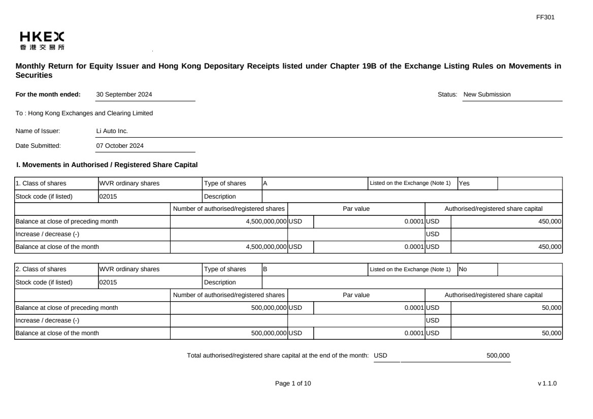 FF301 Page 1 of 10 v 1.1.0 Monthly Return for Equity Issuer and Hong Kong Depositary Receipts listed under Chapter 19B of the Exchange Listing Rules on Movements in Securities For the month ended: 30 September 2024 Status: New Submission To : Hong Kong Exchanges and Clearing Limited Name of Issuer: Li Auto Inc. Date Submitted: 07 October 2024 I. Movements in Authorised / Registered Share Capital 1. Class of shares WVR ordinary shares Type of shares A Listed on the Exchange (Note 1) Yes Stock code (if listed) 02015 Description Number of authorised/registered shares Par value Authorised/registered share capital Balance at close of preceding month 4,500,000,000 USD 0.0001 USD 450,000 Increase / decrease (-) USD Balance at close of the month 4,500,000,000 USD 0.0001 USD 450,000 2. Class of shares WVR ordinary shares Type of shares B Listed on the Exchange (Note 1) No Stock code (if listed) 02015 Description Number of authorised/registered shares Par value Authorised/registered share capital Balance at close of preceding month 500,000,000 USD 0.0001 USD 50,000 Increase / decrease (-) USD Balance at close of the month 500,000,000 USD 0.0001 USD 50,000 Total authorised/registered share capital at the end of the month: USD 500,000