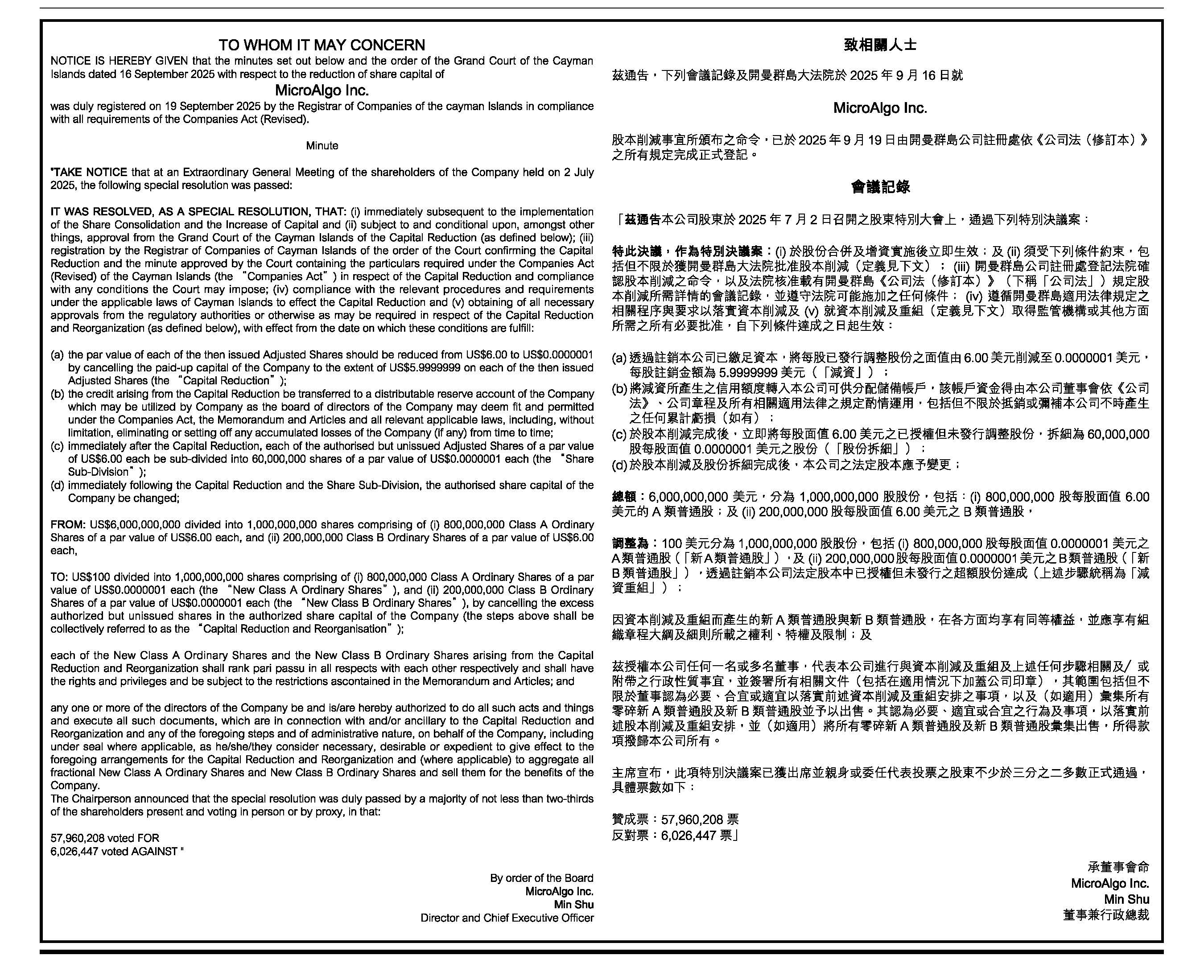 TO WHOM I T MAY CONCERN NOTICE I S HEREBY GIVEN that the m i nutes set out below and the order of the Grand Court of the Cayman Islands dated 16 September 2025 w i th respect to the reduct i on of share capital of M i croAlgo I n c. was duly registered on 19 September 2025 by the Reg i strar of Companies of the cayman I slands in compliance with all requ irements of the Companies Act ( Revise d ) . Minute "TAKE NOT I CE that at an Extraordinary General Meeting of the shareholders of the Company he l d on 2 July 2025, the following special reso l ution was passed: I T WAS RESOLVED, AS A SPEC I AL RESOLUT ION, THAT : (i) immediately subsequent to the i mplementation of the Share Conso l i dation and the Increase of Capital and ( i i ) subject to and cond i tional upon, amongst other th i ngs, approval from the Grand Court of the Cayman I s l ands of the Capital Reduction (as defined below) ; (iii) reg i stration by the Registrar of Companies of Cayman I s l ands of the order of the Court confirmi ng the Cap i tal Reduction and the m i nute approved by the Court containing the particulars requ i red under the Companies Act ( Revise d ) of the Cayman I slands (the "Companies Act" ) i n respect of the Capital Reduction and compliance w i th any conditions the Court may i mpose ; (iv) compliance with the relevant procedures and requirements under the applicable l aws of Cayman Islands to effect the Capital Reduction and (v) obtaining of all necessary approvals from the regulatory authorities or otherwise as may be requ i red in respect of the Cap i tal Reduction and Reorganization (as defined below) , with effect from the date on wh i ch these cond i t i ons are fulfill : (a) the par value of each of the then i ssued Adjusted Shares should be reduced from US $ 6 . 00 to US $ 0 . 0000001 by cancelling the paid - up capital of the Company to the extent of US $ 5 . 9999999 on each of the then issued Adjusted Shares ( the "Capital Reduct i on" ) ; (b) the credit aris i ng from the Capital Reduction be transferred to a distributable reserve account of the Company wh i ch may be utilized by Company as the board of directors of the Company may deem fit and permitted under the Companies Act, the Memorandum and Articles and all relevant applicable laws, inc l uding, without lim i tation, eliminating or setting off any accumulated l osses of the Company ( i f an y ) from t i me to time ; (c) immediate l y after the Capital Reduction, each of the authorised but unissued Adjusted Shares of a par value of US $ 6 . 00 each be sub - d i vided i nto 60 , 000 , 000 shares of a par value of US $ 0 . 0000001 each ( the · Share Sub - Division· ) ; (d) immediate l y fo l lowing the Capital Reduction and the Share Sub - Divis i on, the authorised share capital of the Company be changed ; FROM : US $ 6 , 000 , 000 , 000 divided into 1 , 000 , 000 , 000 shares comprising of (i) 800 , 000 , 000 Class A Ordinary Shares of a par value of US $ 6 . 00 each, and (i i ) 200 , 000 , 000 Class B Ordinary Shares of a par value of US $ 6 . 00 each, TO : US $ 100 divided into 1 , 000 , 000 , 000 shares compris i ng of ( i ) 800 , 000 , 000 Class A Ord i nary Shares of a par value of US $ 0 . 0000001 each ( the "New C l ass A Ordinary Shares" ) , and (i i ) 200 , 000 , 000 Class B Ord i nary Shares of a par va l ue of US $ 0 . 0000001 each (the "New Class B Ordinary Shares" ) , by cancelling the excess authorized but unissued shares in the authorized share capital of the Company ( the steps above shall be collective l y referred to as the "Cap i tal Reduction and Reorganisation" ) ; each of the New Class A Ordinary Shares and the New C l ass B Ordinary Shares aris i ng from the Capital Reduction and Reorganization shall rank pari passu i n all respects w i th each other respect i vely and shal l have the rights and priv i leges and be subject to the restr i ctions ascontained i n the Memorandum and Articles ; and any one or more of the directors of the Company be and is/are hereby authorized to do all such acts and th i ngs and execute all such documents, which are in connection with and/or ancillary to the Capital Reduction and Reorganizat i on and any of the foregoing steps and of administrat i ve nature, on behalf of the Company, inc l uding under seal where appl icable, as he/she/they consider necessary, desirab l e or expedient to give effect to the foregoing arrangements for the Capital Reduction and Reorganization and {where app l icabl e ) to aggregate all fract i onal New Class A Ordinary Shares and New C l ass B Ordinary Shares and sell them for the benefits of the Company . The Chairperson announced t h at the special resolution was duly passed by a majority of not less than two - thirds of the shareholders present and vot i ng in person or by proxy, in that : 57,960 ,208 voted FOR 6 , 026,447 voted AGAINST " By order of the Board MicroA l go I n c. Min Shu Director and Chief Execut i ve Officer M i croA l go I n c. filt 1J * '. † :.f i lf ffi"2$ · B 2025 9 Jl 19 El ffi lffl M i } ttffit 2 .PJ T nl.>Eif /JX;I E 1l: 0 ( 1} C fil" ) ) • •· • • • : ro m& • • • • : & 0 • 1 ' • # *· :f ! fi l 1 ' li lffl ma57':: 1ttlifilt* IJ C> EJ t 1 ' :5c ) : ( iii ) lffl M 1 } ttiff i 1l: IDt* U 2 $ · P J. & > ti: llti lffl M ( 1} ( fil"* ) ) ( l ' fM f i} J ) m.J:Efilt * . P .ff ffla \ J't" · m'tj' ii j • J.rn2ff fiil f 1 4 : (iv) m lff l M m AAJ:EZ ffi!Hfiff; >.l< P J . l'.W* IJ ) & ( v) gt · * IJ & kt † . C > E J t l' ) ' c ) - - ft!! . 1 : J " rn:J ? fr 2 . P .ff l0 tt/l · † l ' 9 1J i ! i 1 4 it/JX;2 B Jill 5& : (a) tt * B .lE · 4ijfil{Bgfi m t 1 ' 1 2 00®:ffi 6.00 :l[;l \ llJ o.0000001 :7[; · 4ijfilttt j w 5.9999999 j[; < r J ) ; (b) J i .1T 2w - m m : 1Jt • A* miij { l .F · .F ffi * i } •• - e - 1& < m :m jf flll * 1 } 1 ' * $ ) · • fi&J i .f f fl*€ll Y B 1 m 2m.J:Ef.lm m · ttffl1 ' !lN Z 1£fii1 I U t 115 <t m fl ) : (c) IDt* U Mif /JX;f · .!l.P 4ijmtOO®: 6.00 :7[;2 B fl@.