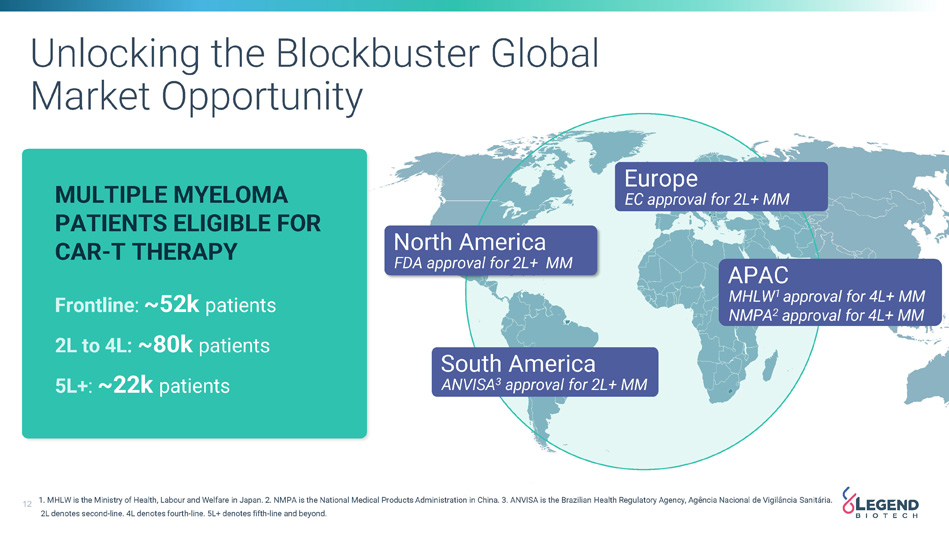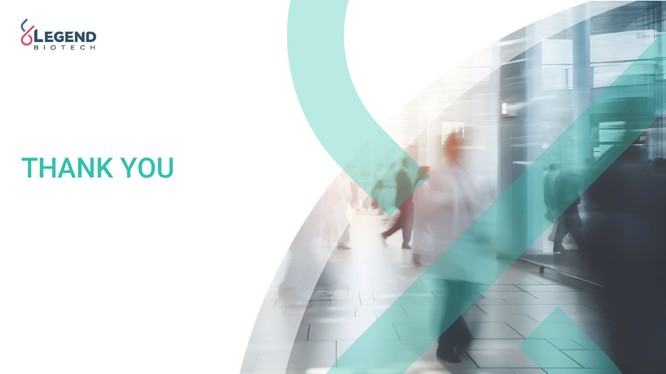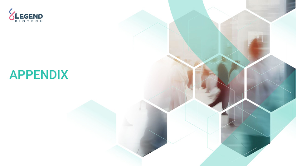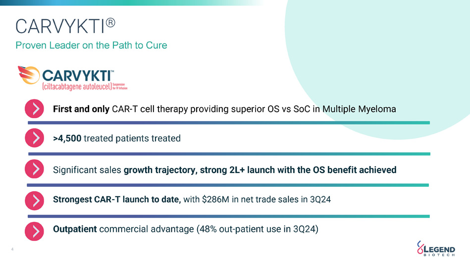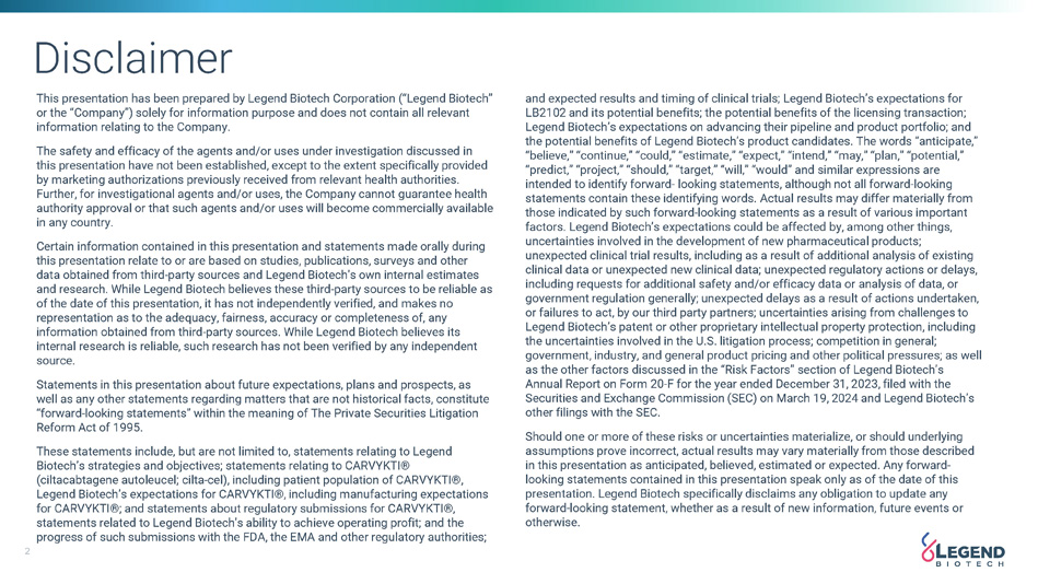 2 Disclaimer This presentation has been prepared by Legend Biotech Corporation (“Legend Biotech” or the “Company”) solely for information purpose and does not contain all relevant information relating to the Company. The safety and efficacy of the agents and/or uses under investigation discussed in this presentation have not been established, except to the extent specifically provided by marketing authorizations previously received from relevant health authorities. Further, for investigational agents and/or uses, the Company cannot guarantee health authority approval or that such agents and/or uses will become commercially available in any country. Certain information contained in this presentation and statements made orally during this presentation relate to or are based on studies, publications, surveys and other data obtained from third - party sources and Legend Biotech's own internal estimates and research. While Legend Biotech believes these third - party sources to be reliable as of the date of this presentation, it has not independently verified, and makes no representation as to the adequacy, fairness, accuracy or completeness of, any information obtained from third - party sources. While Legend Biotech believes its internal research is reliable, such research has not been verified by any independent source. Statements in this presentation about future expectations, plans and prospects, as well as any other statements regarding matters that are not historical facts, constitute “forward - looking statements” within the meaning of The Private Securities Litigation Reform Act of 1995. These statements include, but are not limited to, statements relating to Legend Biotech’s strategies and objectives; statements relating to CARVYKTI® (ciltacabtagene autoleucel; cilta - cel), including patient population of CARVYKTI®, Legend Biotech’s expectations for CARVYKTI®, including manufacturing expectations for CARVYKTI®; and statements about regulatory submissions for CARVYKTI®, statements related to Legend Biotech's ability to achieve operating profit; and the progress of such submissions with the FDA, the EMA and other regulatory authorities; and expected results and timing of clinical trials; Legend Biotech’s expectations for LB2102 and its potential benefits; the potential benefits of the licensing transaction; Legend Biotech’s expectations on advancing their pipeline and product portfolio; and the potential benefits of Legend Biotech’s product candidates. The words “anticipate,” “believe,” “continue,” “could,” “estimate,” “expect,” “intend,” “may,” “plan,” “potential,” “predict,” “project,” “should,” “target,” “will,” “would” and similar expressions are intended to identify forward - looking statements, although not all forward - looking statements contain these identifying words. Actual results may differ materially from those indicated by such forward - looking statements as a result of various important factors. Legend Biotech’s expectations could be affected by, among other things, uncertainties involved in the development of new pharmaceutical products; unexpected clinical trial results, including as a result of additional analysis of existing clinical data or unexpected new clinical data; unexpected regulatory actions or delays, including requests for additional safety and/or efficacy data or analysis of data, or government regulation generally; unexpected delays as a result of actions undertaken, or failures to act, by our third party partners; uncertainties arising from challenges to Legend Biotech’s patent or other proprietary intellectual property protection, including the uncertainties involved in the U.S. litigation process; competition in general; government, industry, and general product pricing and other political pressures; as well as the other factors discussed in the “Risk Factors” section of Legend Biotech’s Annual Report on Form 20 - F for the year ended December 31, 2023, filed with the Securities and Exchange Commission (SEC) on March 19, 2024 and Legend Biotech’s other filings with the SEC. Should one or more of these risks or uncertainties materialize, or should underlying assumptions prove incorrect, actual results may vary materially from those described in this presentation as anticipated, believed, estimated or expected. Any forward - looking statements contained in this presentation speak only as of the date of this presentation. Legend Biotech specifically disclaims any obligation to update any forward - looking statement, whether as a result of new information, future events or otherwise.