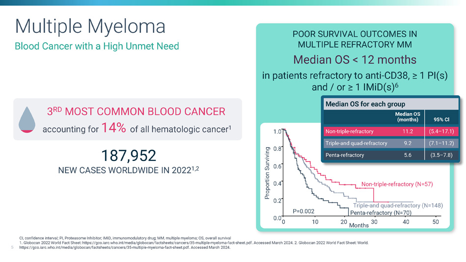 CI, confidence interval; PI, Proteasome Inhibitor; IMiD, immunomodulatory drug; MM, multiple myeloma; OS, overall survival 1. Globocan 2022 World Fact Sheet: https://gco.iarc.who.int/media/globocan/factsheets/cancers/35 - multiple - myeloma - fact - sheet.pdf. Accessed March 2024. 2. Globocan 2022 World Fact Sheet: World. 5 https://gco.iarc.who.int/media/globocan/factsheets/cancers/35 - multiple - myeloma - fact - sheet.pdf. Accessed March 2024. Multiple Myeloma Blood Cancer with a High Unmet Need 3 RD MOST COMMON BLOOD CANCER accounting for 14% of all hematologic cancer 1 187,952 NEW CASES WORLDWIDE IN 2022 1,2 POOR SURVIVAL OUTCOMES IN MULTIPLE REFRACTORY MM Median OS < 12 months in patients refractory to anti - CD38, ≥ 1 PI(s) and / or ≥ 1 IMiD(s) 6 1.0 0.8 0.6 0.4 0.2 0.0 0 30 40 50 Months Proportion Surviving Non - triple - refractory (N=57) Triple - and quad - refractory (N=148) Penta - refractory (N=70) P=0.002 10 20 Median OS for each group 95% Cl Median OS (months) (5.4 – 17.1) 11.2 Non - triple - refractory (7.1 – 11.2) 9.2 Triple - and quad - refractory (3.5 – 7.8) 5.6 Penta - refractory