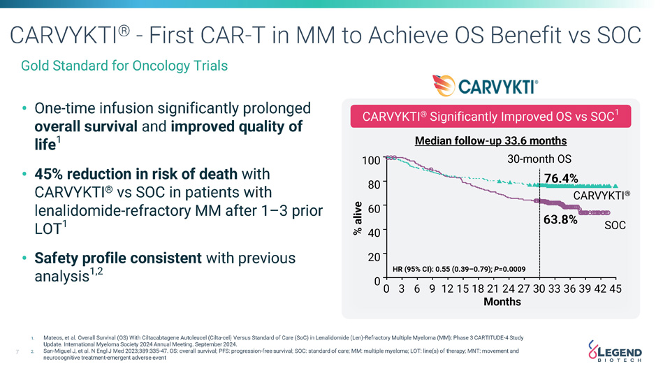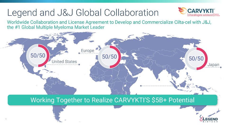 6 Legend and J&J Global Collaboration Worldwide Collaboration and License Agreement to Develop and Commercialize Cilta - cel with J&J, the #1 Global Multiple Myeloma Market Leader 50/50 United States Europe 50/50 Japan 50/50 Working Together to Realize CARVYKTI’S $5B+ Potential