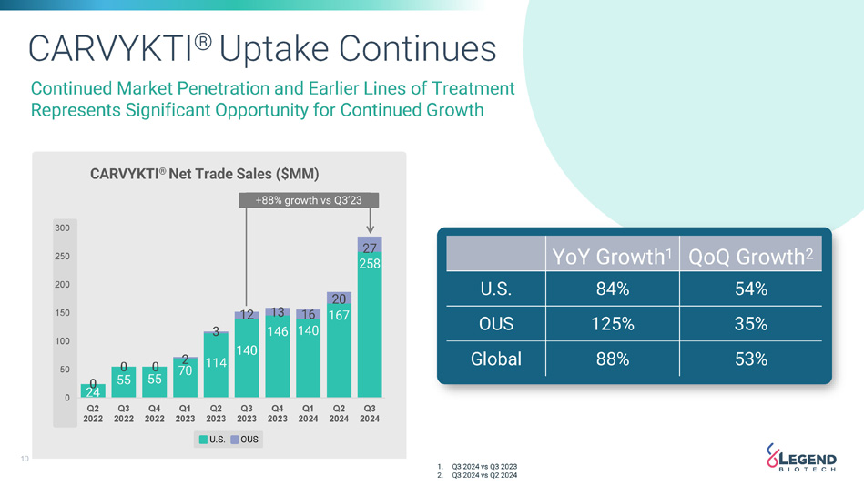 9 Data Source: Companies' public filings. A New Standard for CAR - T Launches CARVYKTI ® - I NDUSTRY LEADI NG EARLY LAUNCH PERFO RMANCE FI RST TEN Q UARTERS O UTPERFO RMI NG HI STO RI CAL CAR - T LAUNCHES Quarterly sales ($MM) 286 102 387 98 224 124 450 400 350 300 250 200 150 100 50 0 Q1 Q2 Q3 Q4 Q5 Q6 Q7 Q8 Q9 Q10 Q11 Q12 Q13 Q14 Q15 Q16 Q17 Q18 Q19 Q20 Q21 Q22 Q23 Q24 Q25 Q26 Q27 Q28 Quarters since launch WORLDWIDE SALES OF CAR - T THERAPIES, BY QUARTER OF LAUNCH (IN $MM) Carvykti Kymriah Yescarta Tecartus Breyanzi Abecma