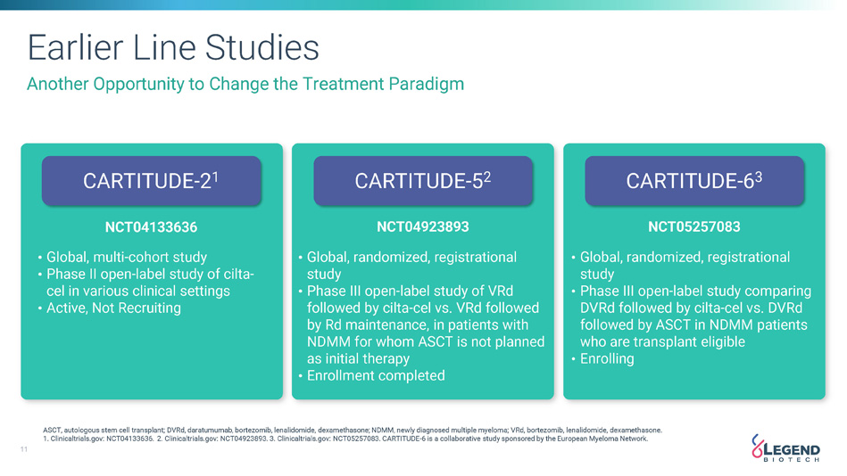 10 CARVYKTI ® Uptake Continues Continued Market Penetration and Earlier Lines of Treatment Represents Significant Opportunity for Continued Growth QoQ Growth 2 YoY Growth 1 54% 84% U.S. 35% 125% OUS 53% 88% Global 24 55 55 70 114 140 146 140 167 258 0 0 0 2 3 12 13 16 20 27 0 50 100 150 200 250 CARVYKTI ® Net Trade Sales ($MM) +88% growth vs Q3’23 300 Q2 Q3 Q4 Q1 Q2 Q3 Q4 Q1 Q2 Q3 2022 2022 2022 2023 2023 2023 2023 2024 2024 2024 U.S. OUS 1. Q3 2024 vs Q3 2023 2. Q3 2024 vs Q2 2024