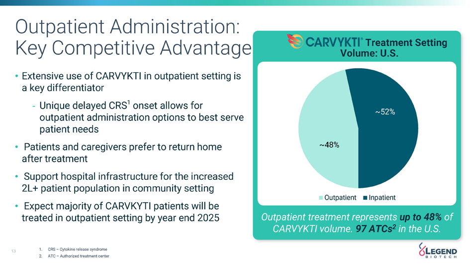 12 Unlocking the Blockbuster Global Market Opportunity MULTIPLE MYELOMA PATIENTS ELIGIBLE FOR CAR - T THERAPY Frontline : ~52k patients 2L to 4L: ~80k patients 5L+ : ~22k patients 1. MHLW is the Ministry of Health, Labour and Welfare in Japan. 2. NMPA is the National Medical Products Administration in China. 3. ANVISA is the Brazilian Health Regulatory Agency, Agência Nacional de Vigilância Sanitária. 2L denotes second - line. 4L denotes fourth - line. 5L+ denotes fifth - line and beyond. APAC MHLW 1 approval for 4L+ MM NMPA 2 approval for 4L+ MM North America FDA approval for 2L+ MM Europe EC approval for 2L+ MM South America ANVISA 3 approval for 2L+ MM