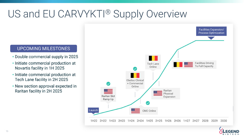14 Global Manufacturing Footprint Raritan, NJ US / EU / JP / ROW Launch/ Commercial Site for CARVYKTI ® x GMP Operational • Approval of new Raritan section expected in 2H25 Morris Plains, NJ Novartis CMO Site x Clinical production started July 2024 • Commercial production expected in 1H 2025 Expanding to Meet Growing Global Demand US FACILITIES EU FACILITIES Ghent, Belgium: Tech Lane Future Site for CARVYKTI ® • Clinical production expected in 1Q25 and commercial production expected in 4Q25 pending regulatory approval Ghent, Belgium: Obelisc Commercial Site for CARVYKTI ® x Clinical production started January 2024 and commercial production started in September 2024 Current Median Turn Around Time is 32 Days