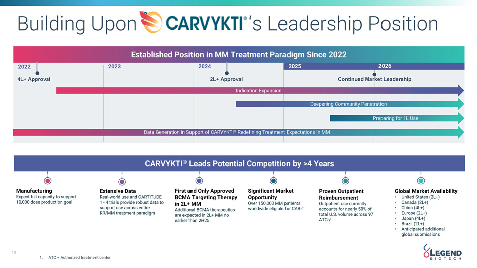 15 US and EU CARVYKTI ® Supply Overview 1H22 2H22 1H23 2H23 1H24 2H24 1H25 2H25 1H26 2H26 1H27 2H27 2028 2029 2030 Launch Facilities Expansion/ Process Optimization Raritan Slot Ramp Up Obelisc Clinical + Commercial Online Tech Lane Online CMO Online Raritan Physical Expansion Facilities Driving To Full Capacity UPCOMING MILESTONES • Double commercial supply in 2025 • Initiate commercial production at Novartis facility in 1H 2025 • Initiate commercial production at Tech Lane facility in 2H 2025 • New section approval expected in Raritan facility in 2H 2025