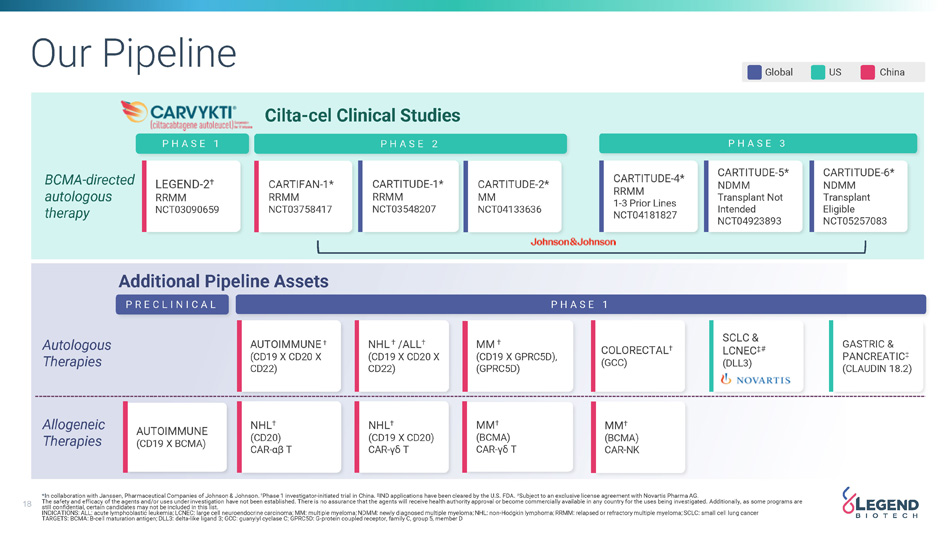 18 *I n collaboration with Janssen, Pharmaceutical Companies of Johnson & Johnson. † Phase 1 investigator - initiated trial in China. ‡ IND applications have been cleared by the U.S. FDA. # Subject to an exclusive license agreement with Novartis Pharma AG. The safety and efficacy of the agents and/or uses under investigation have not been established. There is no assurance that the agents will receive health authority approval or become commercially available in any country for the uses being investigated. Additionally, as some programs are still confidential, certain candidates may not be included in this list. INDICATIONS: ALL: acute lymphoblastic leukemia; LCNEC: large cell neuroendocrine carcinoma; MM: multiple myeloma; NDMM: newly diagnosed multiple myeloma; NHL: non - Hodgkin lymphoma; RRMM: relapsed or refractory multiple myeloma; SCLC: small cell lung cancer TARGETS: BCMA: B - cell maturation antigen; DLL3: delta - like ligand 3; GCC: guanylyl cyclase C; GPRC5D: G - protein coupled receptor, family C, group 5, member D Global US China Autologous Therapies BCMA - directed autologous therapy * P H A S E 3 LEGEND - 2 † RRMM NCT03090659 CARTIFAN - 1* RRMM NCT03758417 CARTITUDE - 1* RRMM NCT03548207 CARTITUDE - 2* MM NCT04133636 CARTITUDE - 4* RRMM 1 - 3 Prior Lines NCT04181827 CARTITUDE - 5* NDMM Transplant Not Intended NCT04923893 CARTITUDE - 6* NDMM Transplant Eligible NCT05257083 Cilta - cel Clinical Studies P H A S E 2 P H A S E 1 P H A S E 1 NHL † /ALL † (CD19 X CD20 X CD22) GASTRIC & PANCREATIC ‡ (CLAUDIN 18.2) SCLC & LCNEC ‡# (DLL3) COLORECTAL † (GCC) Additional Pipeline Assets P R E C L I N I C A L Allogeneic Therapies MM † (BCMA) CAR - γδ T NHL † (CD19 X CD20) CAR - γδ T NHL † (CD20) CAR - αβ T MM † (BCMA) CAR - NK MM † (CD19 X GPRC5D), (GPRC5D) AUTOIMMUNE † (CD19 X CD20 X CD22) AUTOIMMUNE (CD19 X BCMA) Our Pipeline