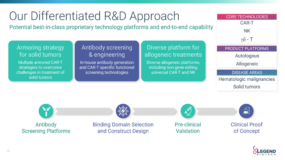19 Our Differentiated R&D Approach Potential best - in - class proprietary technology platforms and end - to - end capability Armoring strategy for solid tumors Multiple armored CAR - T strategies to overcome challenges in treatment of solid tumors Diverse platform for allogeneic treatments Diverse allogeneic platforms, including non - gene editing universal CAR - T and NK Antibody screening & engineering In - house antibody generation and CAR - T - specific functional screening technologies Antibody Screening Platforms Binding Domain Selection and Construct Design Pre - clinical Validation Clinical Proof of Concept CORE TECHNOLOGIES PRODUCT PLATFORMS Autologous Allogeneic DISEASE AREAS Hematologic malignancies Solid tumors CAR - T NK - T