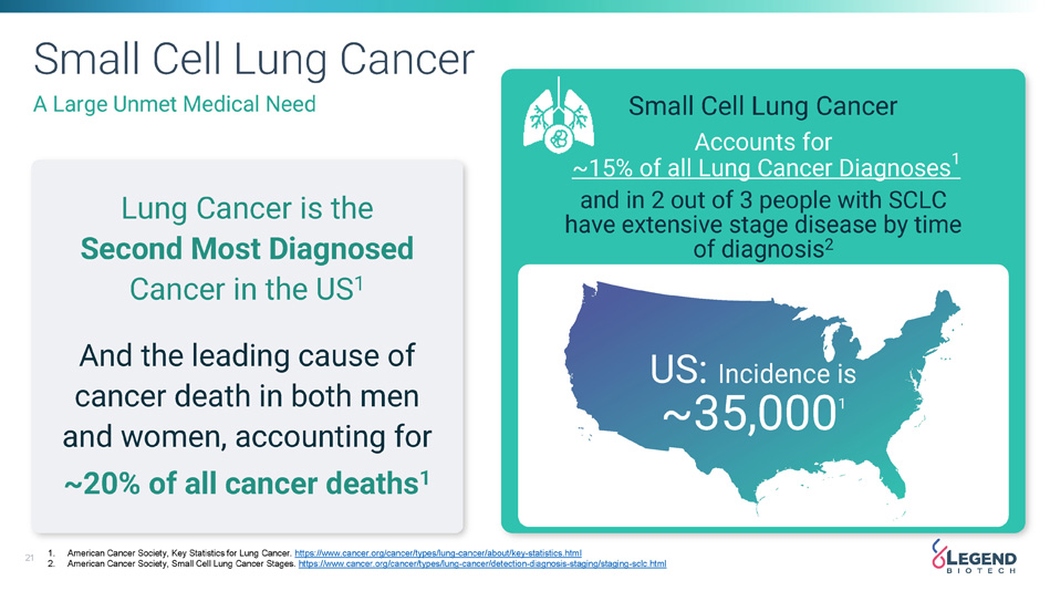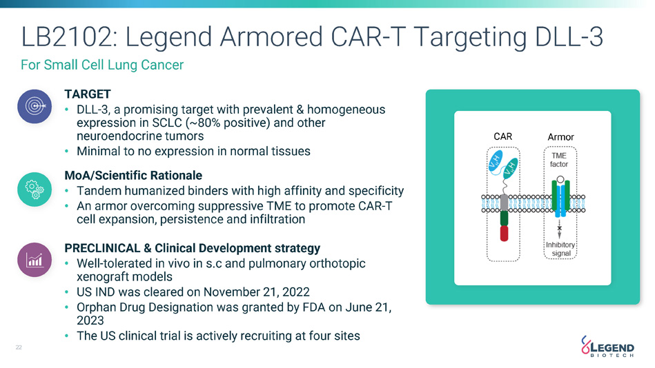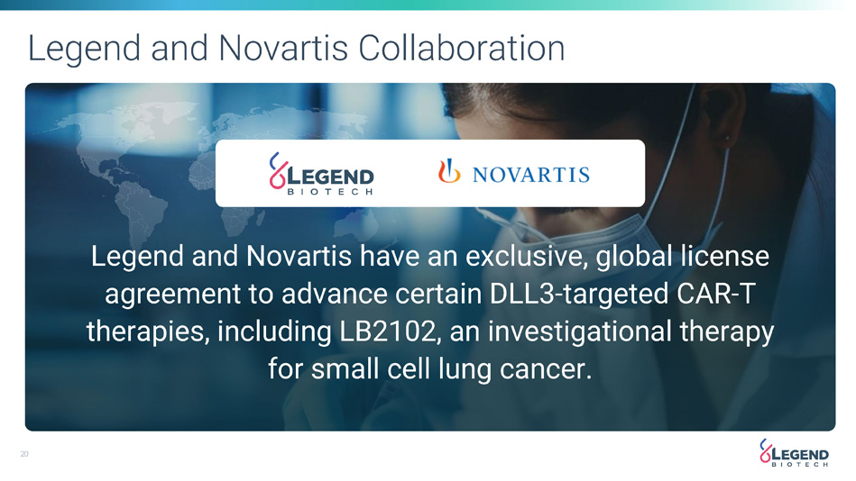 20 Legend and Novartis Collaboration Legend and Novartis have an exclusive, global license agreement to advance certain DLL3 - targeted CAR - T therapies, including LB2102, an investigational therapy for small cell lung cancer.