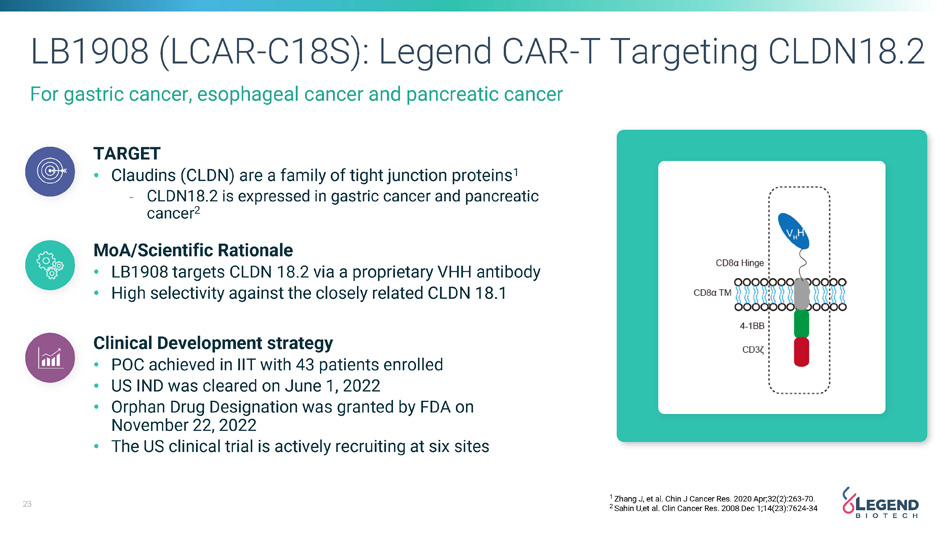 22 LB2102: Legend Armored CAR - T Targeting DLL - 3 For Small Cell Lung Cancer TARGET • DLL - 3, a promising target with prevalent & homogeneous expression in SCLC (~80% positive) and other neuroendocrine tumors • Minimal to no expression in normal tissues MoA/Scientific Rationale • Tandem humanized binders with high affinity and specificity • An armor overcoming suppressive TME to promote CAR - T cell expansion, persistence and infiltration PRECLINICAL & Clinical Development strategy • Well - tolerated in vivo in s.c and pulmonary orthotopic xenograft models • US IND was cleared on November 21, 2022 • Orphan Drug Designation was granted by FDA on June 21, 2023 • The US clinical trial is actively recruiting at four sites CAR Armor
