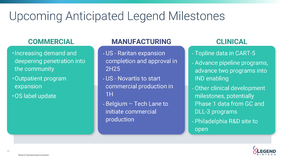 24 * Novartis Pharmaceuticals Corporation Upcoming Anticipated Legend Milestones COMMERCIAL • Increasing demand and deepening penetration into the community • Outpatient program expansion • OS label update CLINICAL • Topline data in CART - 5 • Advance pipeline programs, advance two programs into IND enabling • Other clinical development milestones, potentially Phase 1 data from GC and DLL - 3 programs • Philadelphia R&D site to open MANUFACTURING • US - Raritan expansion completion and approval in 2H25 • US - Novartis to start commercial production in 1H • Belgium – Tech Lane to initiate commercial production