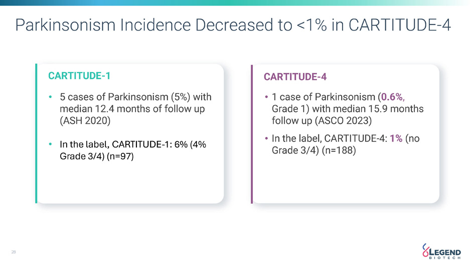 28 Parkinsonism Incidence Decreased to <1% in CARTITUDE - 4 CARTITUDE - 1 • 5 cases of Parkinsonism (5%) with median 12.4 months of follow up (ASH 2020) • In the label, CARTITUDE - 1: 6% (4% Grade 3/4) (n=97) CARTITUDE - 4 • 1 case of Parkinsonism ( 0.6% , Grade 1) with median 15.9 months follow up (ASCO 2023) • In the label, CARTITUDE - 4: 1% (no Grade 3/4) (n=188)