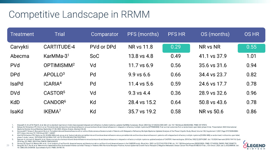 Competitive Landscape in RRMM Treatment Trial Comparator PFS (months) PFS HR OS (months) OS HR 0.55 NR vs NR 0.29 NR vs 11.8 PVd or DPd CARTITUDE - 4 Carvykti 1.01 41.1 vs 37.9 0.49 13.8 vs 4.8 SoC KarMMa - 3 1 Abecma 0.94 35.6 vs 31.6 0.56 11.7 vs 6.9 Vd OPTIMISMM 2 PVd 0.82 34.4 vs 23.7 0.66 9.9 vs 6.6 Pd APOLLO 3 DPd 0.78 24.6 vs 17.7 0.59 11.4 vs 5.6 Pd ICARIA 4 IsaPd 0.96 28.9 vs 32.6 0.36 9.3 vs 4.4 Vd CASTOR 5 DVd 0.78 50.8 vs 43.6 0.64 28.4 vs 15.2 Kd CANDOR 6 KdD 0.86 NR vs 50.6 0.58 35.7 vs 19.2 Kd IKEMA 7 IsaKd 1. 2. 3. 4. 5. Ailawadhi S, Arnulf B, Patel K, et al. Ide - cel vs standard regimens in triple - class - exposed relapsed and refractory multiple myeloma: updated KarMMa - 3 analyses. Blood. 2024 Dec 5;144(23):2389 - 2401. doi: 10.1182/blood.2024024582. PMID: 39197072. Beksac M, Richardson PR, Oriol A, et al. Pomalidomide, bortezomib, and dexamethasone versuss bortezomib and dexamethasone in relapsed or refractory multiple myeloma (OPTIMISMM): final survival outcomes from a randomized, open - label, phase 3 trial. Presented at: 2023 International Myeloma Society Annual Meeting; September 27 - 30, 2023; Athens, Greece. Abstract OA - 44. Sonneveld P, Terpos E, Boccadoro M, et al. Pomalidomide and Dexamethasone with or without Subcutaneous Daratumumab in Patients with Relapsed or Refractory Multiple Myeloma: Updated Analysis of the Phase 3 Apollo Study, Blood, Volume 138, Supplement 1,2021,Page 2747,ISSN 0006 - 4971,https://doi.org/10.1182/blood - 2021 - 146907. Attal M, Richardson PG, Rajkumar SV, ICARIA - MM study group, et al. Isatuximab plus pomalidomide and low - dose dexamethasone versus pomalidomide and low - dose dexamethasone in patients with relapsed and refractory multiple myeloma (ICARIA - MM): a randomised, multicentre, open - label, phase 3 study. Lancet. 2019;394(10214):2096 - 2107. doi:10.1016/S0140 - 6736(19)32556 - 5. Spencer A, Lentzsch S, Weisel K, et al. Daratumumab plus bortezomib and dexamethasone versus bortezomib and dexamethasone in relapsed or refractory multiple myeloma: updated analysis of CASTOR. Haematologica. 2018 Dec;103(12):2079 - 2087. doi: 10.3324/haematol.2018.194118. Epub 2018 Sep 20. PMID: 30237264; PMCID: PMC6269293. 6. Usmani SZ, Quach H, Mateos MV, et al.. Final analysis of carfilzomib, dexamethasone, and daratumumab vs carfilzomib and dexamethasone in the CANDOR study. Blood Adv. 2023 Jul 25;7(14):3739 - 3748. doi: 10.1182/bloodadvances.2023010026. PMID: 37163358; PMCID: PMC10368773. 29 7. Hong RX, Xu F, Xia W, et al. Metronomic Capecitabine Plus Aromatase Inhibitor as Initial Therapy in Patients With Hormone Receptor - Positive, Human Epidermal Growth Factor Receptor 2 - Negative Metastatic Breast Cancer - The Phase III MECCA Trial. J Clin Oncol. 2025 Jan 2:JCO2400938. doi: 10.1200/JCO.24.00938. Epub ahead of print. PMID: 39746176.