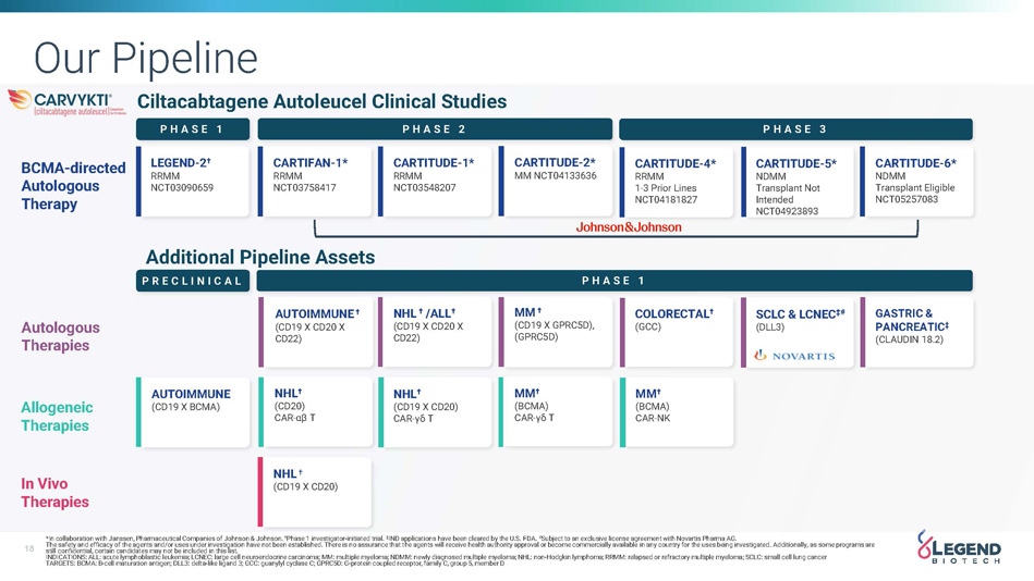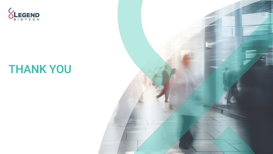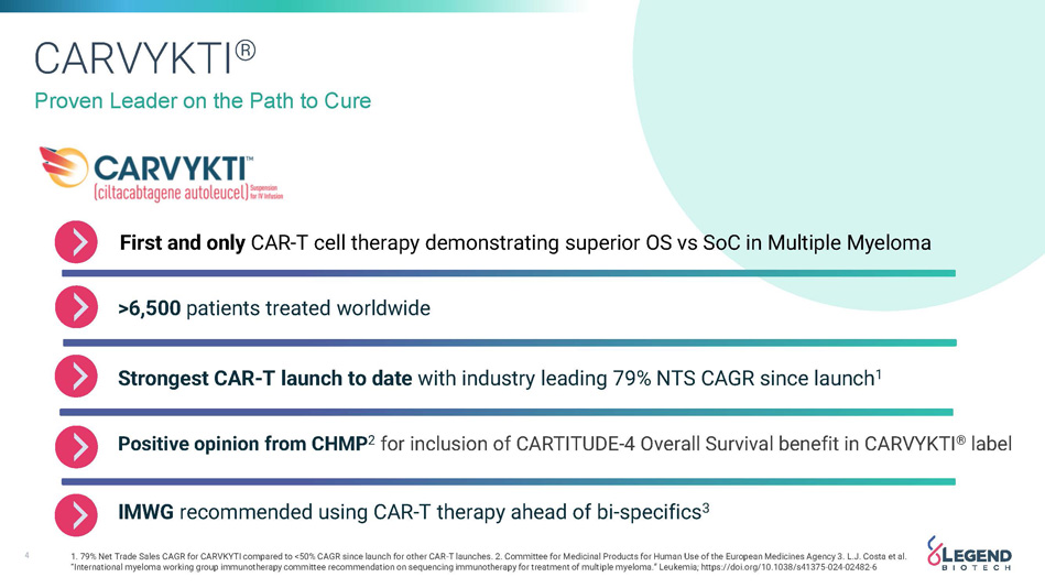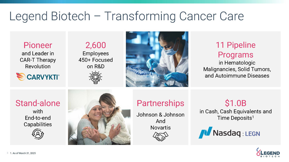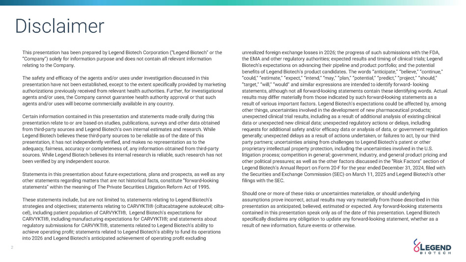 2 Disclaimer This presentation has been prepared by Legend Biotech Corporation (“Legend Biotech” or the “Company”) solely for information purpose and does not contain all relevant information relating to the Company. The safety and efficacy of the agents and/or uses under investigation discussed in this presentation have not been established, except to the extent specifically provided by marketing authorizations previously received from relevant health authorities. Further, for investigational agents and/or uses, the Company cannot guarantee health authority approval or that such agents and/or uses will become commercially available in any country. Certain information contained in this presentation and statements made orally during this presentation relate to or are based on studies, publications, surveys and other data obtained from third - party sources and Legend Biotech's own internal estimates and research. While Legend Biotech believes these third - party sources to be reliable as of the date of this presentation, it has not independently verified, and makes no representation as to the adequacy, fairness, accuracy or completeness of, any information obtained from third - party sources. While Legend Biotech believes its internal research is reliable, such research has not been verified by any independent source. Statements in this presentation about future expectations, plans and prospects, as well as any other statements regarding matters that are not historical facts, constitute “forward - looking statements” within the meaning of The Private Securities Litigation Reform Act of 1995. These statements include, but are not limited to, statements relating to Legend Biotech’s strategies and objectives; statements relating to CARVYKTI® (ciltacabtagene autoleucel; cilta - cel) , including patient population of CARVYKTI®, Legend Biotech’s expectations for CARVYKTI®, including manufacturing expectations for CARVYKTI®; and statements about regulatory submissions for CARVYKTI®, statements related to Legend Biotech's ability to achieve operating profit; statements related to Legend Biotech’s ability to fund its operations into 2026 and Legend Biotech’s anticipated achievement of operating profit excluding unrealized foreign exchange losses in 2026; the progress of such submissions with the FDA, the EMA and other regulatory authorities; expected results and timing of clinical trials; Legend Biotech’s expectations on advancing their pipeline and product portfolio; and the potential benefits of Legend Biotech’s product candidates. The words “anticipate,” “believe,” “continue,” “could,” “estimate,” “expect,” “intend,” “may,” “plan,” “potential,” “predict,” “project,” “should,” “target,” “will,” “would” and similar expressions are intended to identify forward - looking statements, although not all forward - looking statements contain these identifying words. Actual results may differ materially from those indicated by such forward - looking statements as a result of various important factors. Legend Biotech’s expectations could be affected by, among other things, uncertainties involved in the development of new pharmaceutical products; unexpected clinical trial results, including as a result of additional analysis of existing clinical data or unexpected new clinical data; unexpected regulatory actions or delays, including requests for additional safety and/or efficacy data or analysis of data, or government regulation generally; unexpected delays as a result of actions undertaken, or failures to act, by our third party partners; uncertainties arising from challenges to Legend Biotech’s patent or other proprietary intellectual property protection, including the uncertainties involved in the U.S. litigation process; competition in general; government, industry, and general product pricing and other political pressures; as well as the other factors discussed in the “Risk Factors” section of Legend Biotech’s Annual Report on Form 20 - F for the year ended December 31, 2024, filed with the Securities and Exchange Commission (SEC) on March 11, 2025 and Legend Biotech’s other filings with the SEC. Should one or more of these risks or uncertainties materialize, or should underlying assumptions prove incorrect, actual results may vary materially from those described in this presentation as anticipated, believed, estimated or expected. Any forward - looking statements contained in this presentation speak only as of the date of this presentation. Legend Biotech specifically disclaims any obligation to update any forward - looking statement, whether as a result of new information, future events or otherwise.