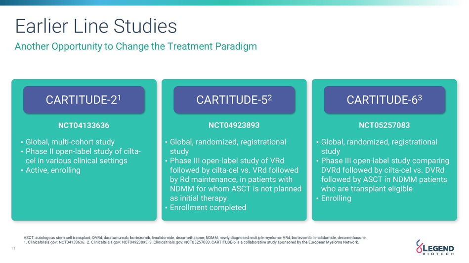 10 10 +135% growth vs Q1’24 CARVYKTI ® Net Trade Sales ($MM) U.S. OUS 24 55 55 70 114 140 146 140 167 258 304 318 0 0 0 2 3 12 13 16 20 27 31 51 0 50 100 150 200 250 300 350 400 Q2 2022 Q3 2022 Q4 2022 Q1 2023 Q2 2023 Q3 2023 Q4 2023 Q1 2024 Q2 2024 Q3 2024 Q4 2024 Q1 2025 → U.S. QoQ growth of 5% primarily driven by manufacturing performance and capacity expansion • Number of activated U.S. treatment sites increased to 114 • Continued strong demand with >50% utilization in earlier line settings → OUS QoQ growth of 65% primarily driven by: • Capacity expansion • Ongoing launch strength, with recent launches in the UK, Denmark, Israel, Spain and Belgium Continued market penetration, population in earlier lines of treatment represents significant opportunity for continued growt h 10 CARVYKTI ® Uptake Continues QoQ Growth 2 YoY Growth 1 5% 127% U.S. 65% 219% OUS 10% 135% Global 1. Q1 2025 vs Q1 2024; 2. Q1 2025 vs Q1 2024 This presentation is for investor relations purposes only - Not for product promotional purposes