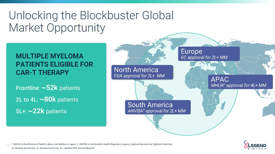 3 11 Pipeline Programs in Hematologic Malignancies, Solid Tumors, and Autoimmune Diseases Legend Biotech – Transforming Cancer Care 1. As of March 31, 2025 Pioneer and Leader in CAR - T Therapy Revolution 2,600 Employees 450+ Focused on R&D Stand - alone with End - to - end Capabilities Partnerships Johnson & Johnson And Novartis $1.0B i n Cash, Cash Equivalents and Time Deposits 1 : LEGN