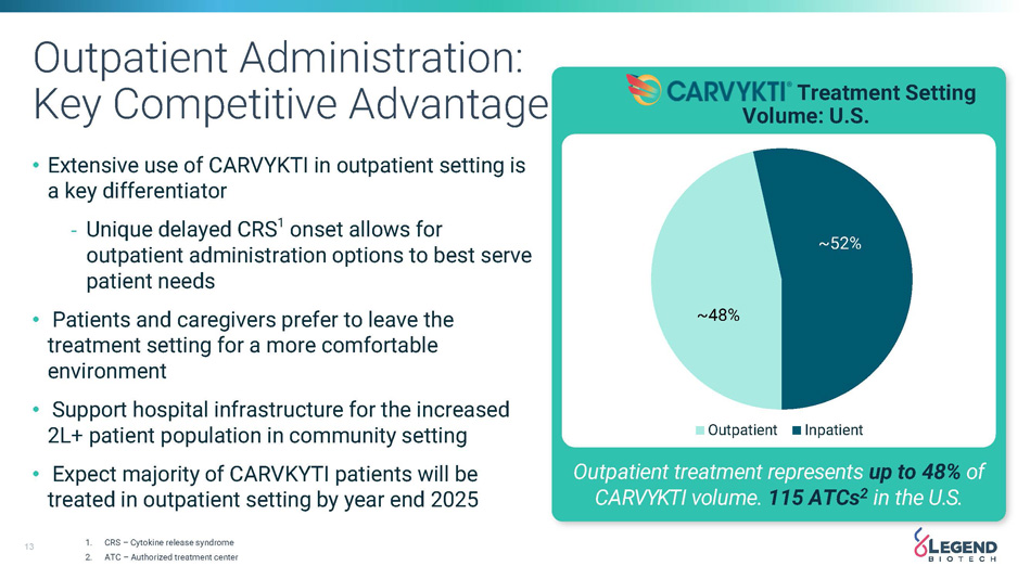12 Unlocking the Blockbuster Global Market Opportunity MULTIPLE MYELOMA PATIENTS ELIGIBLE FOR CAR - T THERAPY Frontline : ~52k patients 2L to 4L: ~80k patients 5L+ : ~22k patients 1. MHLW is the Ministry of Health, Labour and Welfare in Japan. 2. ANVISA is the Brazilian Health Regulatory Agency, Agência Nacional de Vigilância Sanitária. 2L denotes second - line. 4L denotes fourth - line. 5L+ denotes fifth - line and beyond. APAC MHLW 1 approval for 4L+ MM North America FDA approval for 2L+ MM Europe EC approval for 2L+ MM South America ANVISA 3 approval for 2L+ MM