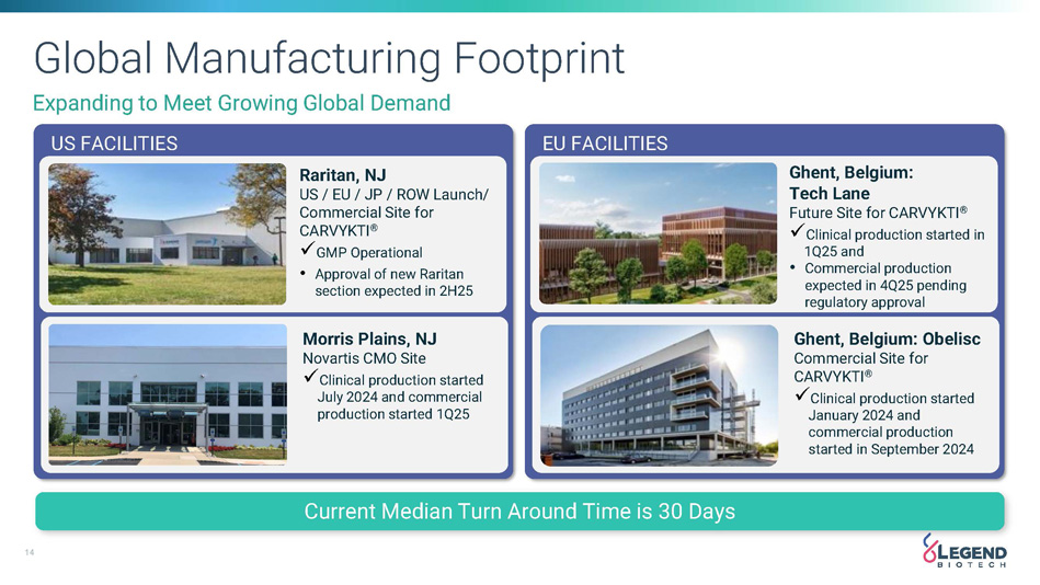 13 Outpatient Administration: Key Competitive Advantage • Extensive use of CARVYKTI in outpatient setting is a key differentiator - Unique delayed CRS 1 onset allows for outpatient administration options to best serve patient needs • Patients and caregivers prefer to leave the treatment setting for a more comfortable environment • Support hospital infrastructure for the increased 2L+ patient population in community setting • Expect majority of CARVKYTI patients will be treated in outpatient setting by year end 2025 1. CRS – Cytokine release syndrome 2. ATC – A uthorized treatment center ~48% ~52% Treatment Setting Volume: U.S. Outpatient Inpatient Outpatient treatment represents up to 48 % of CARVYKTI volume. 115 ATCs 2 in the U.S.