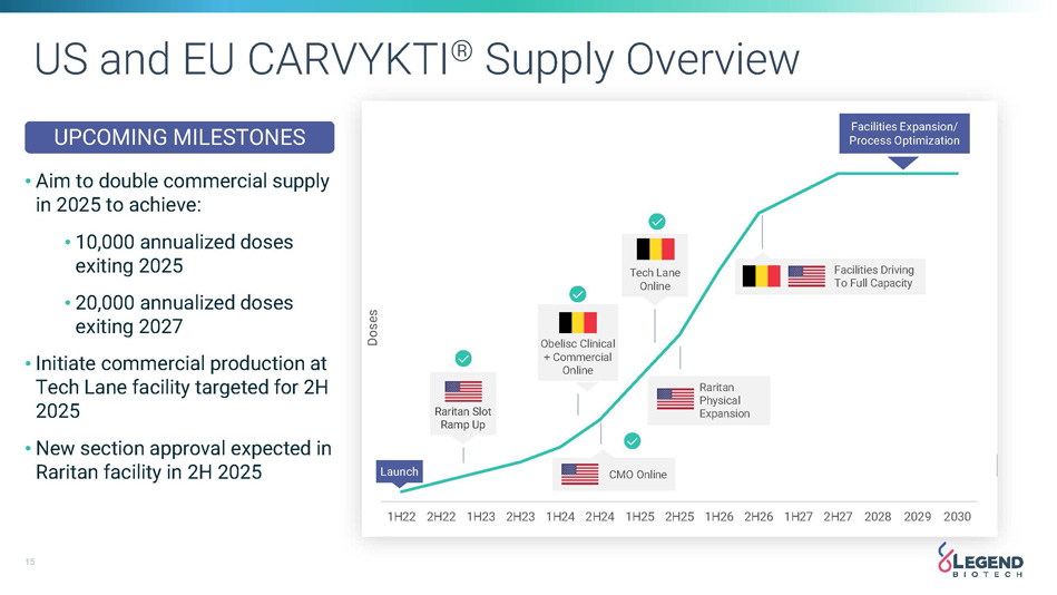 14 Global Manufacturing Footprint Expanding to Meet Growing Global Demand US FACILITIES Raritan, NJ US / EU / JP / ROW Launch/ Commercial Site for CARVYKTI ® x GMP Operational • Approval of new Raritan section expected in 2H25 Morris Plains, NJ Novartis CMO Site x Clinical production started July 2024 and c ommercial production started 1Q25 EU FACILITIES Ghent, Belgium: Tech Lane Future Site for CARVYKTI ® x Clinical production started in 1Q25 and • Commercial production expected in 4Q25 pending regulatory approval Ghent, Belgium: Obelisc Commercial Site for CARVYKTI ® x Clinical production started Januar y 2024 and c ommercial production started in September 2024 Current Median Turn Around Time is 30 Days