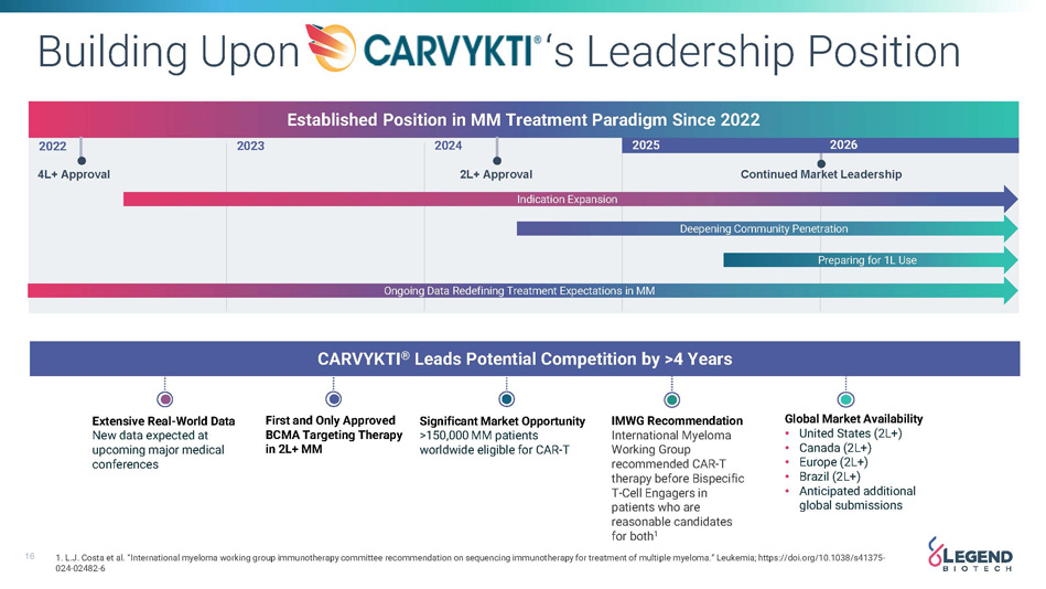 15 US and EU CARVYKTI ® Supply Overview 1H22 2H22 1H23 2H23 1H24 2H24 1H25 2H25 1H26 2H26 1H27 2H27 2028 2029 2030 Doses Launch Facilities Expansion/ Process Optimization Raritan Slot Ramp Up Obelisc Clinical + Commercial Online Tech Lane Online CMO Online Raritan Physical Expansion Facilities Driving To Full Capacity • Aim to double commercial supply in 2025 to achieve: • 10,000 annualized doses exiting 2025 • 20,000 annualized doses exiting 2027 • Initiate commercial production at Tech Lane facility targeted for 2H 2025 • New section approval expected in Raritan facility in 2H 2025 UPCOMING MILESTONES