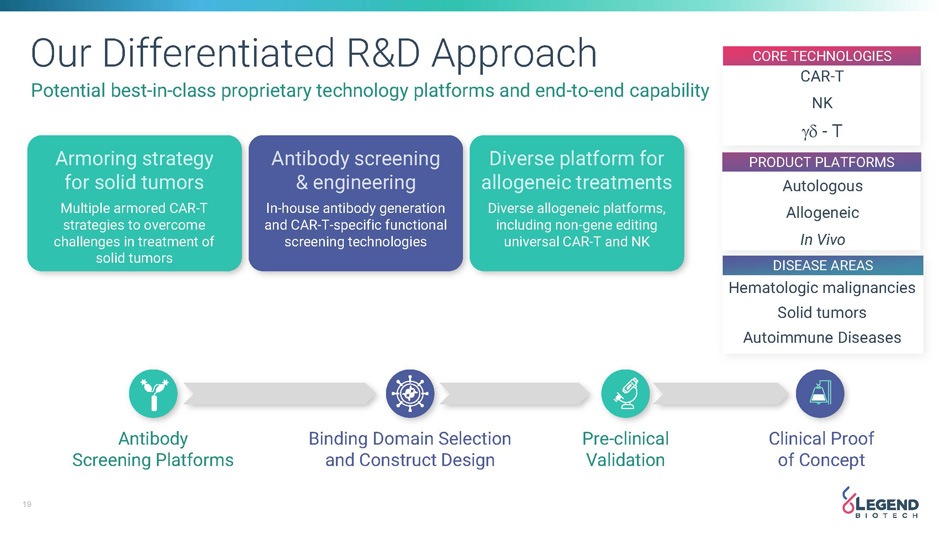 18 *I n collaboration with Janssen, Pharmaceutical Companies of Johnson & Johnson. † Phase 1 investigator - initiated trial. ‡ IND applications have been cleared by the U.S. FDA. # Subject to an exclusive license agreement with Novartis Pharma AG. The safety and efficacy of the agents and/or uses under investigation have not been established. There is no assurance that t he agents will receive health authority approval or become commercially available in any country for the uses being investigated . A dditionally, as some programs are still confidential, certain candidates may not be included in this list. INDICATIONS: ALL: acute lymphoblastic leukemia; LCNEC: large cell neuroendocrine carcinoma; MM: multiple myeloma; NDMM: newly diagnosed multiple myeloma; NHL: non - Hodgkin lymphoma; RRMM: relapsed or refractory multiple m yeloma; SCLC: small cell lung cancer TARGETS: BCMA: B - cell maturation antigen; DLL3: delta - like ligand 3; GCC: guanylyl cyclase C; GPRC5D: G - protein coupled receptor , family C, group 5, member D Autologous Therapies BCMA - directed Autologous Therapy PHASE 2 PHASE 3 LEGEND - 2 † RRMM NCT03090659 CARTIFAN - 1* RRMM NCT03758417 CARTITUDE - 1* RRMM NCT03548207 CARTITUDE - 2* MM NCT04133636 CARTITUDE - 4* RRMM 1 - 3 Prior Lines NCT04181827 CARTITUDE - 5* NDMM Transplant Not Intended NCT04923893 CARTITUDE - 6* NDMM Transplant Eligible NCT05257083 Ciltacabtagene Autoleucel Clinical Studies PHASE 1 PRECLINICAL PHASE 1 NHL † /ALL † (CD19 X CD20 X CD22) GASTRIC & PANCREATIC ‡ (CLAUDIN 18.2) SCLC & LCNEC ‡# (DLL3) COLORECTAL † (GCC) Additional Pipeline Assets Allogeneic Therapies MM † (BCMA) CAR - γδ T NHL † (CD19 X CD20) CAR - γδ T NHL † ( CD20 ) CAR - αβ T MM † (BCMA) CAR - NK MM † (CD19 X GPRC5D), (GPRC5D) AUTOIMMUNE † (CD19 X CD20 X CD22) AUTOIMMUNE (CD19 X BCMA) Our Pipeline In Vivo Therapies NHL † (CD19 X CD20)