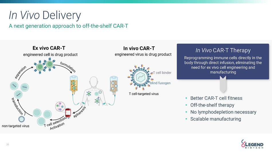 19 Autologous Allogeneic In Vivo Hematologic malignancies Solid tumor s Autoimmune Diseases Our Differentiated R&D Approach Potential best - in - class proprietary technology platforms and end - to - end capability Armoring strategy for solid tumors Multiple armored CAR - T strategies to overcome challenges in treatment of solid tumors Diverse platform for allogeneic treatments Diverse allogeneic platforms, including non - gene editing universal CAR - T and NK Antibody screening & engineering In - house antibody generation and CAR - T - specific functional screening technologies Antibody Screening Platforms Binding Domain Selection and Construct Design Pre - clinical Validation Clinical Proof of Concept CORE TECHNOLOGIES PRODUCT PLATFORMS DISEASE AREAS CAR - T NK    - T