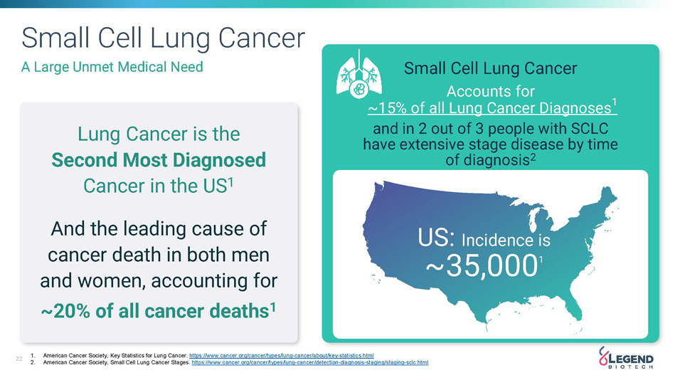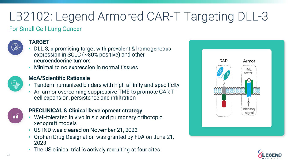 21 Legend and Novartis Collaboration Legend and Novartis have an exclusive, global license agreement to advance certain DLL3 - targeted CAR - T therapies, including LB2102, an investigational therapy for small cell lung cancer.