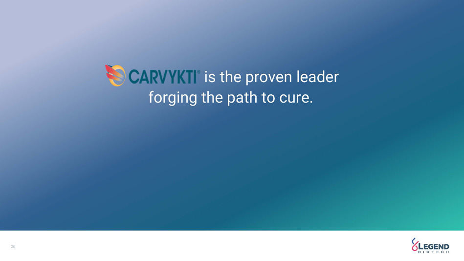 25 * Novartis Pharmaceuticals Corporation Upcoming Anticipated Legend Milestones COMMERCIAL • Increasing demand and deepening penetration into the community • Outpatient program expansion • OS label update CLINICAL • Topline data in CART - 5 • Advance pipeline programs, advance two programs into IND enabling • Other clinical development milestones, potentially Phase 1 data from GC and DLL - 3 programs • Philadelphia R&D site to open MANUFACTURING • US - Raritan expansion completion and approval in 2H25 • Belgium – Tech Lane to initiate commercial production