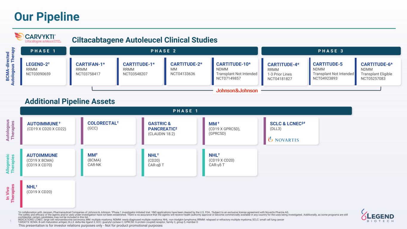 1 *In collaboration with Janssen, Pharmaceutical Companies of Johnson & Johnson. †Phase 1 investigator-initiated trial. ‡IND applications have been cleared by the U.S. FDA. #Subject to an exclusive license agreement with Novartis Pharma AG. The safety and efficacy of the agents and/or uses under investigation have not been established. There is no assurance that the agents will receive health authority approval or become commercially available in any country for the uses being investigated. Additionally, as some programs are still confidential, certain candidates may not be included in this list. INDICATIONS: LCNEC: large cell neuroendocrine carcinoma; MM: multiple myeloma; NDMM: newly diagnosed multiple myeloma; NHL: non-Hodgkin lymphoma; RRMM: relapsed or refractory multiple myeloma; SCLC: small cell lung cancer TARGETS: BCMA: B-cell maturation antigen; DLL3: delta-like ligand 3; GCC: guanylyl cyclase C; GPRC5D: G-protein coupled receptor, family C, group 5, member D Our Pipeline This presentation is for investor relations purposes only - Not for product promotional purposes A u to lo g o u s T h e ra p ie s B C M A -d ir e c te d A u to lo g o u s T h e ra p y P H A S E 2 P H A S E 3 LEGEND-2† RRMM NCT03090659 CARTIFAN-1* RRMM NCT03758417 CARTITUDE-1* RRMM NCT03548207 CARTITUDE-2* MM NCT04133636 CARTITUDE-4* RRMM 1-3 Prior Lines NCT04181827 CARTITUDE-6* NDMM Transplant Eligible NCT05257083 Ciltacabtagene Autoleucel Clinical Studies P H A S E 1 P H A S E 1 SCLC & LCNEC‡# (DLL3) MM † (CD19 X GPRC5D), (GPRC5D) GASTRIC & PANCREATIC‡ (CLAUDIN 18.2) Additional Pipeline Assets A ll o g e n e ic T h e ra p ie s NHL† (CD20) CAR-αβ T MM† (BCMA) CAR-NK NHL† (CD19 X CD20) CAR-γδ T COLORECTAL† (GCC) AUTOIMMUNE † (CD19 X CD20 X CD22) AUTOIMMUNE (CD19 X BCMA) (CD19 X CD70) In V iv o T h e ra p ie s NHL† (CD19 X CD20) CARTITUDE-10* NDMM Transplant Not Intended NCT07149857 CARTITUDE-5 NDMM Transplant Not Intended NCT04923893
