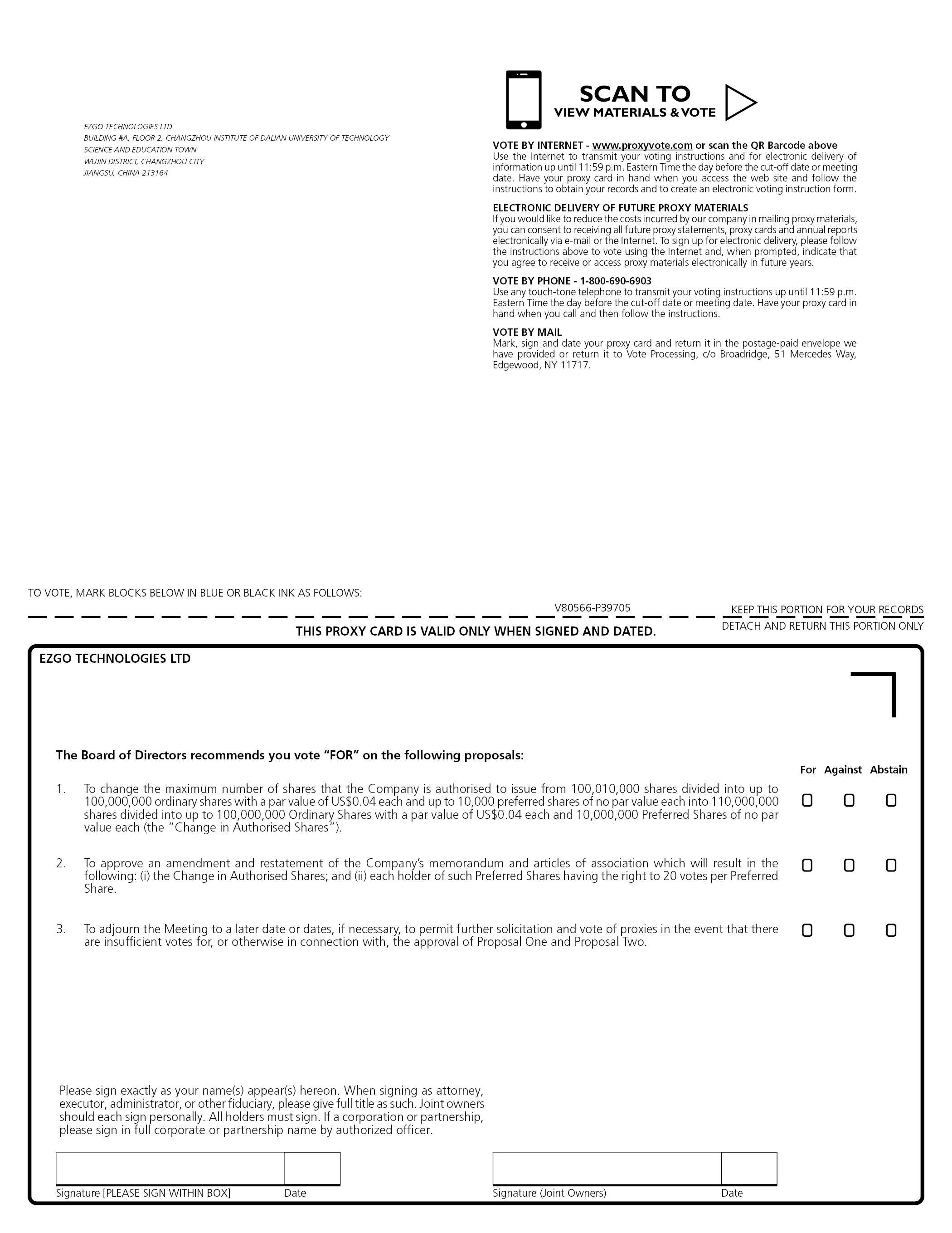 SCAN TO VIEW MATERIALS & VOTE VOTE BY INTERNET - www.proxyvote.com or scan the QR Barcode above Use the Internet to transmit your voting instructions and for electronic delivery of information up until 11:59 p.m. Eastern Time the day before the cut-off date or meeting date. Have your proxy card in hand when you access the web site and follow the instructions to obtain your records and to create an electronic voting instruction form. ELECTRONIC DELIVERY OF FUTURE PROXY MATERIALS If you would like to reduce the costs incurred by our company in mailing proxy materials, you can consent to receiving all future proxy statements, proxy cards and annual reports electronically via e-mail or the Internet. To sign up for electronic delivery, please follow the instructions above to vote using the Internet and, when prompted, indicate that you agree to receive or access proxy materials electronically in future years. VOTE BY PHONE - 1-800-690-6903 Use any touch-tone telephone to transmit your voting instructions up until 11:59 p.m. Eastern Time the day before the cut-off date or meeting date. Have your proxy card in hand when you call and then follow the instructions. VOTE BY MAIL Mark, sign and date your proxy card and return it in the postage-paid envelope we have provided or return it to Vote Processing, c/o Broadridge, 51 Mercedes Way, Edgewood, NY 11717. EZGO TECHNOLOGIES LTD BUILDING #A, FLOOR 2, CHANGZHOU INSTITUTE OF DALIAN UNIVERSITY OF TECHNOLOGY SCIENCE AND EDUCATION TOWN WUJIN DISTRICT, CHANGZHOU CITY JIANGSU, CHINA 213164 TO VOTE, MARK BLOCKS BELOW IN BLUE OR BLACK INK AS FOLLOWS: V80566-P39705 KEEP THIS PORTION FOR YOUR RECORDS THIS PROXY CARD IS VALID ONLY WHEN SIGNED AND DATED. DETACH AND RETURN THIS PORTION ONLY EZGO TECHNOLOGIES LTD The Board of Directors recommends you vote “FOR” on the following proposals: 1. To change the maximum number of shares that the Company is authorised to issue from 100,010,000 shares divided into up to 100,000,000 ordinary shares with a par value of US$0.04 each and up to 10,000 preferred shares of no par value each into 110,000,000 shares divided into up to 100,000,000 Ordinary Shares with a par value of US$0.04 each and 10,000,000 Preferred Shares of no par value each (the “Change in Authorised Shares”). 2. To approve an amendment and restatement of the Company’s memorandum and articles of association which will result in the following: (i) the Change in Authorised Shares; and (ii) each holder of such Preferred Shares having the right to 20 votes per Preferred Share. 3. To adjourn the Meeting to a later date or dates, if necessary, to permit further solicitation and vote of proxies in the event that there are insufficient votes for, or otherwise in connection with, the approval of Proposal One and Proposal Two. For Against Abstain Please sign exactly as your name(s) appear(s) hereon. When signing as attorney, executor, administrator, or other fiduciary, please give full title as such. Joint owners should each sign personally. All holders must sign. If a corporation or partnership, please sign in full corporate or partnership name by authorized officer. Signature [PLEASE SIGN WITHIN BOX] Date Signature (Joint Owners) Date