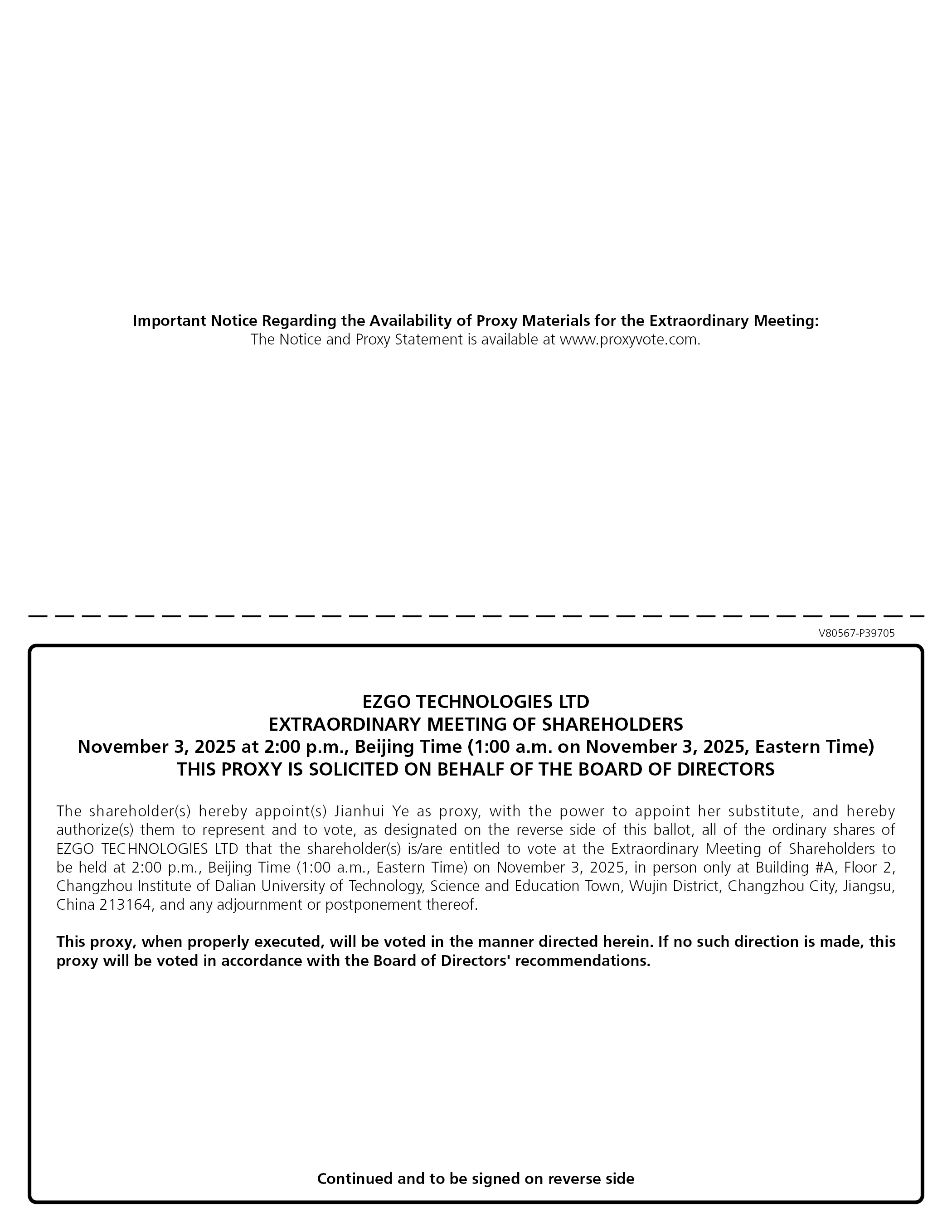 Important Notice Regarding the Availability of Proxy Materials for the Extraordinary Meeting: The Notice and Proxy Statement is available at www.proxyvote.com. V80567-P39705 EZGO TECHNOLOGIES LTD EXTRAORDINARY MEETING OF SHAREHOLDERS November 3, 2025 at 2:00 p.m., Beijing Time (1:00 a.m. on November 3, 2025, Eastern Time) THIS PROXY IS SOLICITED ON BEHALF OF THE BOARD OF DIRECTORS The shareholder(s) hereby appoint(s) Jianhui Ye as proxy, with the power to appoint her substitute, and hereby authorize(s) them to represent and to vote, as designated on the reverse side of this ballot, all of the ordinary shares of EZGO TECHNOLOGIES LTD that the shareholder(s) is/are entitled to vote at the Extraordinary Meeting of Shareholders to be held at 2:00 p.m., Beijing Time (1:00 a.m., Eastern Time) on November 3, 2025, in person only at Building #A, Floor 2, Changzhou Institute of Dalian University of Technology, Science and Education Town, Wujin District, Changzhou City, Jiangsu, China 213164, and any adjournment or postponement thereof. This proxy, when properly executed, will be voted in the manner directed herein. If no such direction is made, this proxy will be voted in accordance with the Board of Directors’ recommendations. Continued and to be signed on reverse side