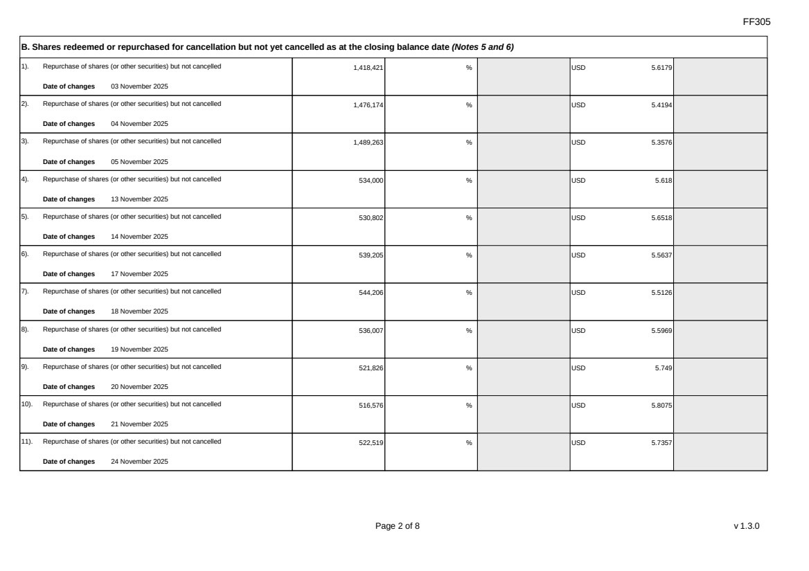 FF305 Page 2 of 8 v 1.3.0 B. Shares redeemed or repurchased for cancellation but not yet cancelled as at the closing balance date (Notes 5 and 6) 1). Repurchase of shares (or other securities) but not cancelled Date of changes 03 November 2025 1,418,421 % USD 5.6179 2). Repurchase of shares (or other securities) but not cancelled Date of changes 04 November 2025 1,476,174 % USD 5.4194 3). Repurchase of shares (or other securities) but not cancelled Date of changes 05 November 2025 1,489,263 % USD 5.3576 4). Repurchase of shares (or other securities) but not cancelled Date of changes 13 November 2025 534,000 % USD 5.618 5). Repurchase of shares (or other securities) but not cancelled Date of changes 14 November 2025 530,802 % USD 5.6518 6). Repurchase of shares (or other securities) but not cancelled Date of changes 17 November 2025 539,205 % USD 5.5637 7). Repurchase of shares (or other securities) but not cancelled Date of changes 18 November 2025 544,206 % USD 5.5126 8). Repurchase of shares (or other securities) but not cancelled Date of changes 19 November 2025 536,007 % USD 5.5969 9). Repurchase of shares (or other securities) but not cancelled Date of changes 20 November 2025 521,826 % USD 5.749 10). Repurchase of shares (or other securities) but not cancelled Date of changes 21 November 2025 516,576 % USD 5.8075 11). Repurchase of shares (or other securities) but not cancelled Date of changes 24 November 2025 522,519 % USD 5.7357