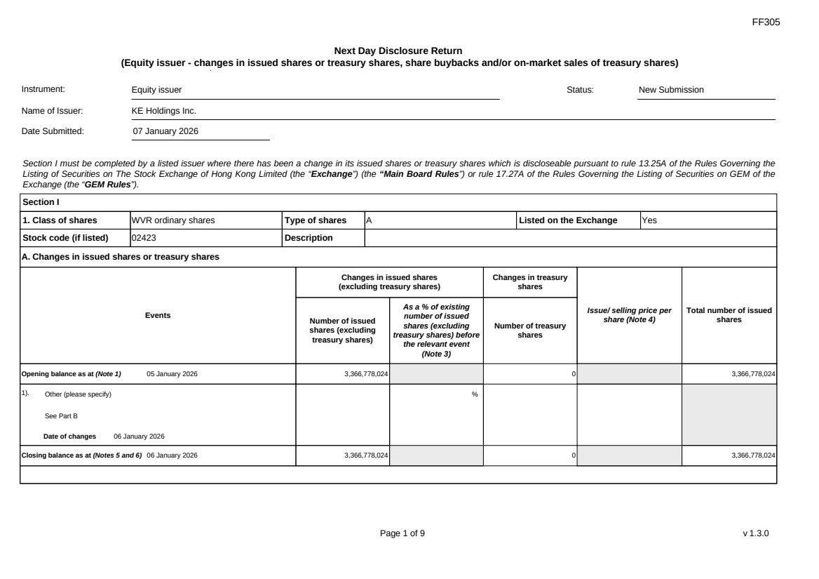 FF305 Page 1 of 9 v 1.3.0 Next Day Disclosure Return (Equity issuer - changes in issued shares or treasury shares, share buybacks and/or on-market sales of treasury shares) Instrument: Equity issuer Status: New Submission Name of Issuer: KE Holdings Inc. Date Submitted: 07 January 2026 Section I must be completed by a listed issuer where there has been a change in its issued shares or treasury shares which is discloseable pursuant to rule 13.25A of the Rules Governing the Listing of Securities on The Stock Exchange of Hong Kong Limited (the “Exchange”) (the “Main Board Rules”) or rule 17.27A of the Rules Governing the Listing of Securities on GEM of the Exchange (the “GEM Rules”). Section I 1. Class of shares WVR ordinary shares Type of shares A Listed on the Exchange Yes Stock code (if listed) 02423 Description A. Changes in issued shares or treasury shares Events Changes in issued shares (excluding treasury shares) Number of issued shares (excluding treasury shares) As a % of existing number of issued shares (excluding treasury shares) before the relevant event (Note 3) Changes in treasury shares Number of treasury shares Issue/ selling price per share (Note 4) Total number of issued shares Opening balance as at (Note 1) 05 January 2026 3,366,778,024 0 3,366,778,024 1). Other (please specify) See Part B Date of changes 06 January 2026 % Closing balance as at (Notes 5 and 6) 06 January 2026 3,366,778,024 0 3,366,778,024