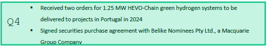 The past year was one defined by both challenges and triumphs for our company, largely mirroring the broader landscape of the dynamic green hydrogen industry. Amidst the turbulence, one overarching theme emerged: positioning for long-term, sustainable success. Throughout the year, we achieved several critical milestones that underscore the meaningful progress we have made towards building a best-in-class green hydrogen company. Notably, we celebrated the recognition of our first revenues, forged strategic partnerships and secured two hydrogen offtake contracts. However, perhaps the most significant breakthrough came with the commercialization and initial sales of our HEVO-Chain solution, which will be a catalyst for substantial growth, particularly as we look ahead to 2024 and beyond.