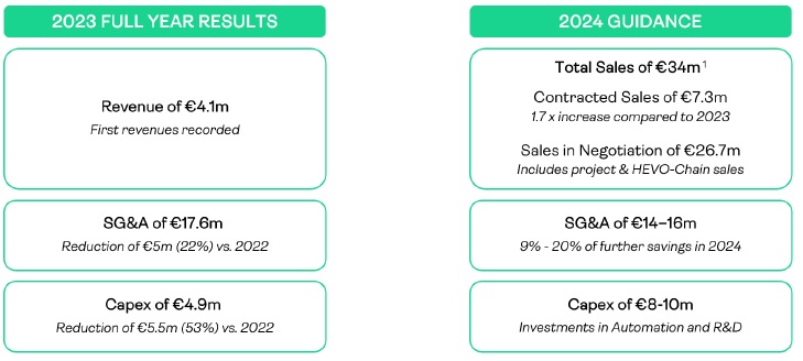 Cash outflows during the fourth quarter of 2023 included investment of €2.1 million in procurement, production, investment in our Benavente production facility and research & development of our HEVO technologies. This represents a reduction of €1.5 million compared to the third quarter of 2023.